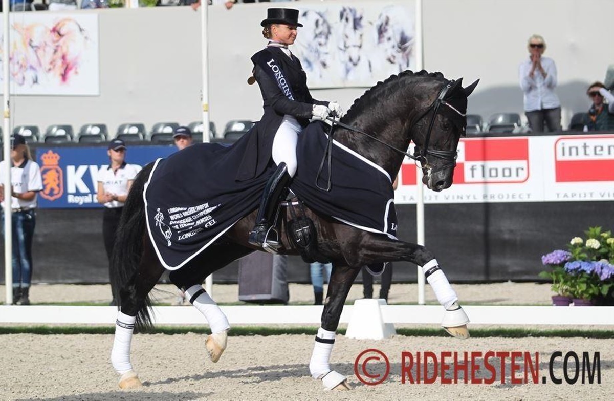 Dansk Varmblodshingsten Sezuan e. Blue Hors Zack/ Blue Hors Don Schufro (opdr. Linette Jæger) har i dag skrevet verdenshistorie ved at vinde sine tredje guldmedalje i verdensmesterskaberne for unge dressurheste. Han vandt sine første to mesterskaber ved UVM-stævnet i tyske Verden i 2014 som 5-års og i 2015 som 6-års, og nu har han ved UVM-stævnet i hollandske Ermelo vundet som 7-års - alle tre mesterskaber er vundet med tyske Dorothee Schneider i sadlen.