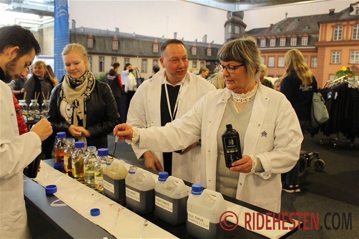 På bland-selv-standen får du udleveret en tom flaske, og efterfølgende kan du altså selv bestemme både duft og farve. Efter de hjælpsomme alkymister fra Nathalie Horsecare har stået for de korrekte blandingsforhold, kan du selv fylde shampoo på flasken. – Det her er jo en glimrende forbrugerundersøgelse, fortæller Helle Kristiansen fra Nathalie Horsecare, - Her kan vi se hvad vores kunder efterspørger, og lige nu er det altså duften af ”Cranbarry,” der sælger bedst.