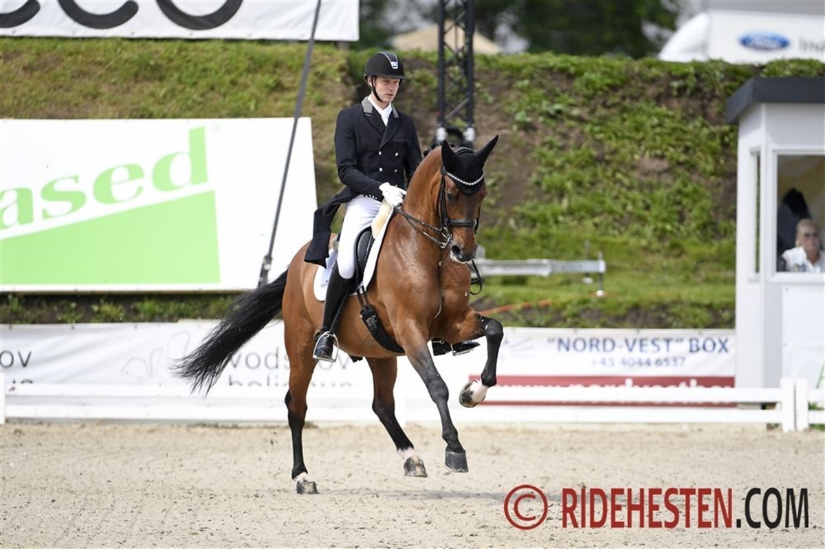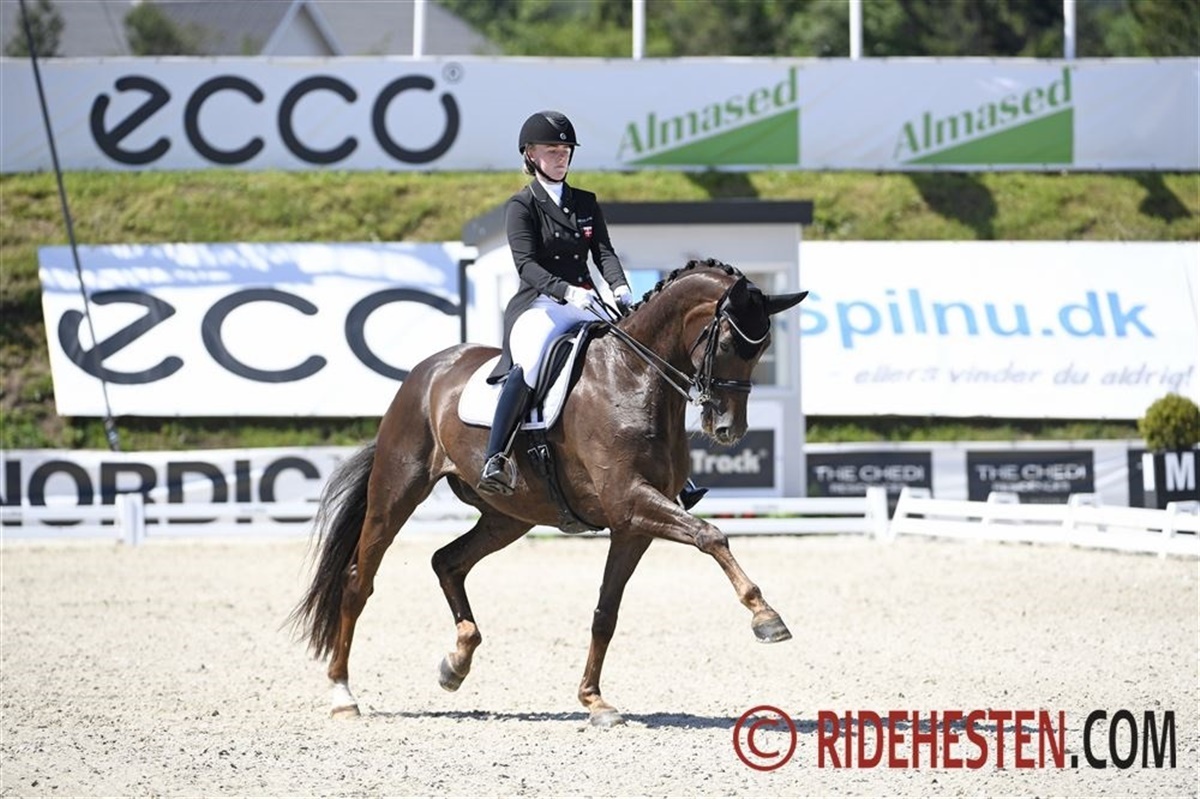 Victoria og Ludwig der Sonnenkönig dansede gennem Intermediairen i dag og sluttede med 75,236% på baggrund af flere 8-taller i bl.a. piaffe og passage. Victoria rider for Helgstrand Dressage, og det samme gør Søren Wind, der har lagt sig ind på andenpladsen med Diego - parret vandt sølv ved sidste års U25-mesterskab. I år fik han 71,342% og dermed har Victoria lagt sig komfortabelt i spidsen af mesterskabet.