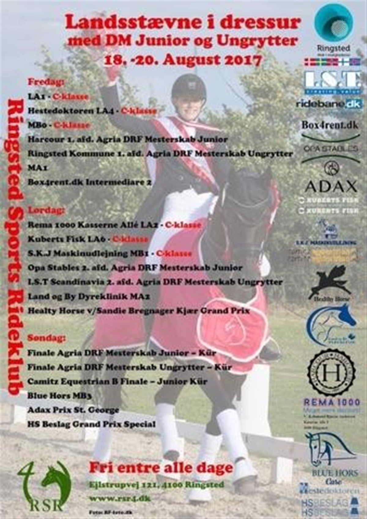 I weekenden 18-20 august slår Ringsted Sports Rideklub i samarbejde med Team CABE og Ridebane.dk dørene op til landsstævne i dressur, hvor der blandt andet skal dystes om de Individuelle DRF Mesterskaber for Juniorer & Youngriders.