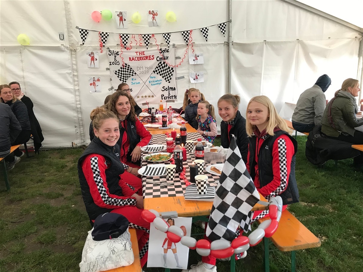Min mor og jeg kørte afsted til Frederikshavn allerede torsdag, for jeg var holdets PRT rytter, så jeg skulle ride om fredagen. I år skulle jeg ride for Gråsten, vi var et rigtigt klubhold, så vi kendte hinanden ret godt for vi har alle Pernille Ørum som træner. Vi havde været sammen inden stævnet for at lave banner og kostumer, og vi havde valgt, at vi skulle være ”The racerkørers.”