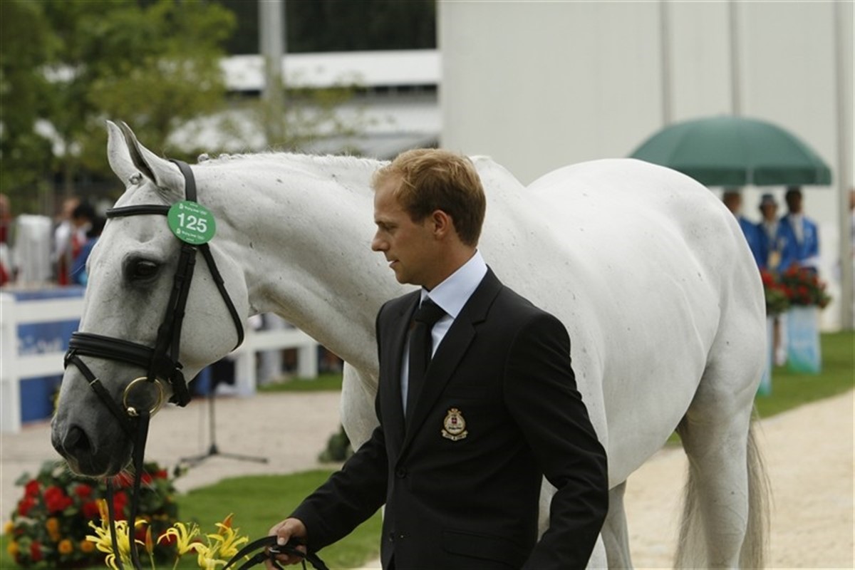 - Det er den hårdeste beslutning jeg endnu har truffet, sagde Peter Flarup til de fremmødte pressefolk. Silver Ray har pådraget sig en mindre skade, som har resulteret i en hævelse af det ene forben. Scanninger har vist, at der heldigvis er tale om en mindre skade, som ikke får betydning for hestens fremtid som konkurrencehest. - Silver Ray er en af verdens bedste militaryheste, det beviste han i terrænet i går, sagde sportschef Jens Erik Majlund. Den danske dyrlæge H.C. Mathiesen bekræftede, at Silver Ray kunne have passeret vet. check i dag, for skaden giver sig udtryk i en hævelse og en lettere ømhed i bevægelse. Begge dele kunne dyrlægen og rytteren have arbejdet væk, men af hensyn til hestens velfærd valgte de i stedet for, at trække Silver Ray ud af konkurrencen. - Hvis det var en medalje vi kæmpede om, så kunne der have været en grund til at beholde ham i konkurrence, nu er det vigtigere at få ham hjem sund og frisk, og så er målet EM og WEG i Kentucky, forklarede Flarup. Silver Ray var i topform, hvilket han også beviste i terrænet, og den danske dyrlæge var imponeret over, hvor hurtigt Silver Ray fik sin vejrtrækning, hjerterytme og temperatur ned på normalværdier. Hvordan skaden er sket er der ikke en entydig forklaring på, men det vigtigste lige nu er da også at få skaden under kontrol, og det har H.C. klaret i samarbejde med den meget kompetente veterinære stab der befinder sig herude.