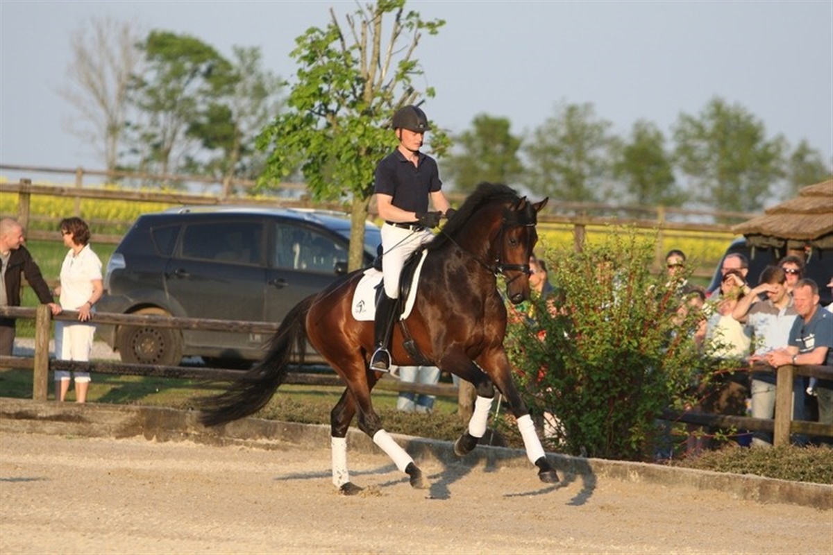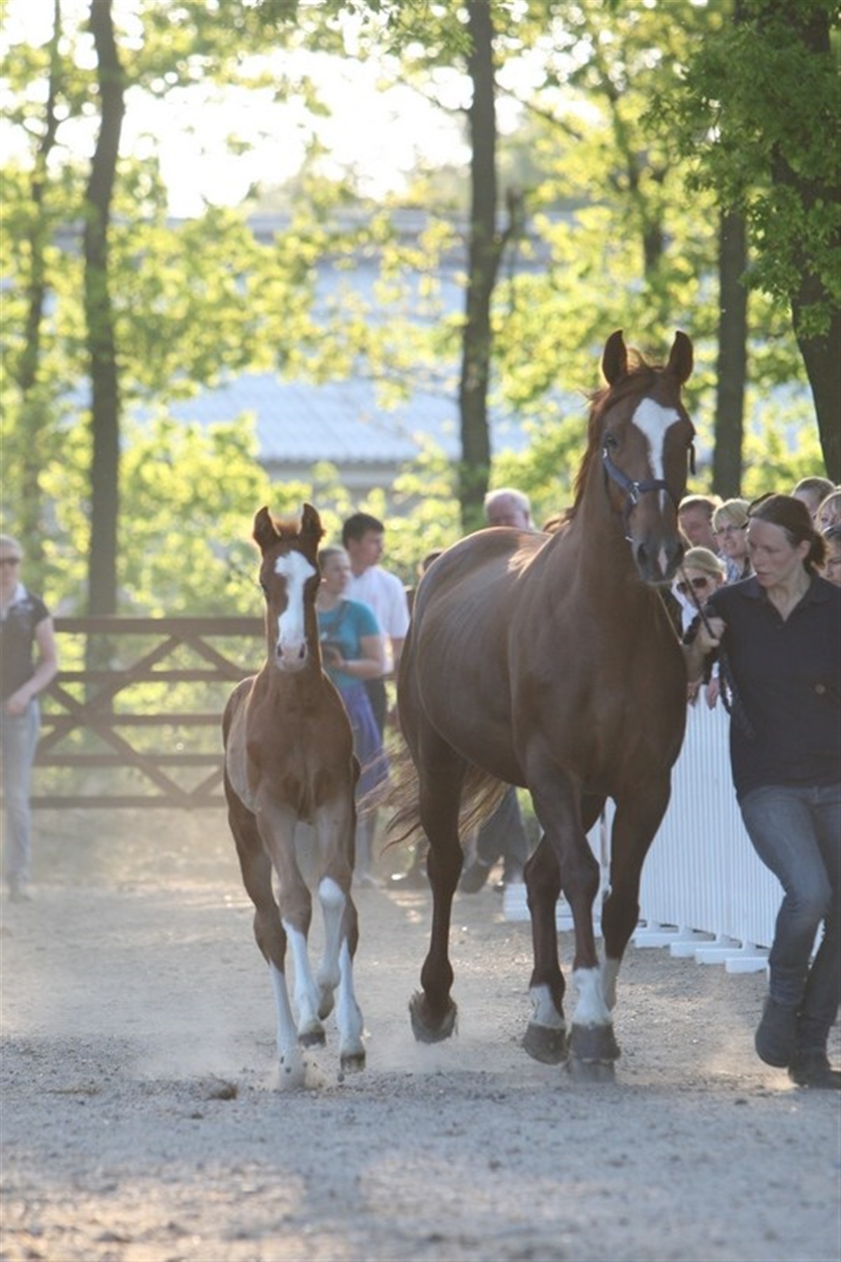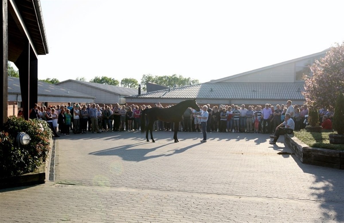 Rigtig mange mennesker havde fundet vej til Blue Hors den 23. maj, og de fremmødte fik på denne solrige majaften lejlighed til at se flere af Blue Hors- og Stutteri Ask-hingstene for hånd, en masse føl og så sluttede aftenens hestedel af med en fremvisning af Blue Hors Erlando under rytter - og så var det tid til grill-pølser og hestesnak. Aftenen startede foran hingstestalden hvor flere hingste Blue Hors og enkelt fra Stutteri Ask blev præsenteret for hånd for de mange fremmødte. Hingstene blev kommenteret af Blue Hors-direktør Esben Møller, der bl.a. fortalte om hingstene præstationer og deres avlsmæssige egenskaber. Publikum fik bl.a. set Blue Hors Rockefeller, Blue Hors Zack, Blue Hors Edelman, Blue Hors Zatchmo, Blue Fletcher, Cavall Ask og fløjhingsten Clifton Ask. Også Don Olymbrio blev vist frem, og som Esben Møller selv udtrykte det, så er Don Olymbrio måske ikke den mest smarte og højtstillede hingst, men han bærer noget af det ypperste dressurblod i sine årer, og han har med sin første følårgang allerede fået vist sit værd i avlen - hvilket de fremmødte fik lejlighed til at opleve senere, da føllene kom på banen. Fremvisningen foran hingststalden blev afsluttet af "kongen af Blue Hors" - Blue Hors Don Schufro. Hingsten er efterhånden blevet 19 år gammel, men han blev fremvist i flot form, og så ud til at nyde opmærksomheden fra de mange mennesker. - Han har et godt liv, han bliver redet hver formiddag, og så går han nogle timer på fold hver dag, fortalte Esben Møller. Herefter gik turen om til hoppestaldene, hvor de fremødte blev præsenteret for ca. 30 føl efter både Stutteri Asks og Blue Hors' hingste. Der var især mange føl efter Blue Hors Don Olymbrio, og på trods af vidt forskellige moderhopper, så var føllene efter Jazz-sønnen i høj grad ensartede føl med en masse udtryk, en flot front og så så de alle ud til at være særdeles velgående. Aftenens hestefremvisninger blev afsluttet på ridebanen, hvor berider Allan U. Grøn fremvist avlshingsten Blue Hors Erlando e. Jazz/Rhodium. Det er ikke mange, der har haft lejlighed til at opleve denne hingst før, og det var da også årsagen til at Esben Møller benyttede lejligheden til at få hingsten vist under rytter. Blue Hors Erlando kunne pga. en skade ikke møde op til årets hingstekåring i Herning, og hingsten blev ligeledes forhindret i at møde op til Dansk Varmblods Efterkåring. På baggrund af sin hollandske kåring og aflagt 10-dages test er hingsten dog blev kåret, og smukke brune hingst tog særdeles godt ud i aftensolen på ridebanen. Herefter var det tid til at nyde en grill-pølse og få sig en god hestesnak - alt i alt en meget god og hyggelig aften på Blue Hors.