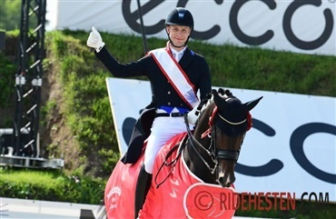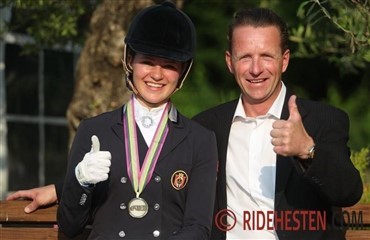Presset var enormt på Nanna Merrald da hun red Millibar op ad midterlinjen - hun vidste, at kravet til hende og Millibar var et ridt til mere end 71%, og da de førende tyskere havde to ryttere på godt 73% og den bedste hollænder lå på 71% var det også klart, at dommerne ikke forærede pointene væk i mesterskabet. Nanna og Millibar leverede imponerende frie traver, flotte sidebevægelser, og da pointtavlen viste godt 73% begyndte den danske lejr igen at trække vejret. Skridten kostede få procenter, og de to skridtpirouetter var til godkendt, men så sprang Millibar an i galop, i stedet for at trave frem. Der lød et gisp fra tilskuerne, Nanna holdt dog nerverne i total ro - bøjede Millibar af, fik hurtigt lavet en overgang, og så fortsatte hun med at levere et klasseridt. Jublen ville næsten ingen ende tage, da Nanna hilste af og resultattavlen viste 72,919%. - Der var pres på, indrømmede Nanna med et stort smil. Hun vidste ikke, hvor meget hun havde redet til, førend hun vendte Millibar rundt for at skridte ud. - Jeg ser aldrig på resultattavlen, det synes jeg ikke er godt, fortæller hun. Da Nanna kom ud fra banen flokkedes hendes holdkammerater om hende: Anna Zibrandtsen, Nanna Bronnée Madsen og Kathrine Sumborg Christensen jublede sammen, da jublen havde lagt sig lidt, sagde Nanna med undren i stemmen: Men fik vi sølv? - Rytterne har redet så cool, med så stort mentalt overskud, det er helt fantastisk, sagde landstræner Jon D. Pedersen, vi havde håbet på en bronzemedalje, men i holdkonkurrencen kan alt ske. Efter sidste års to holdbronzemedaljer troede vi ikke det kunne blive bedre, for det er så svært at komme forbi Holland og Tyskland, men juniorerne viste, at det ikke er umuligt.