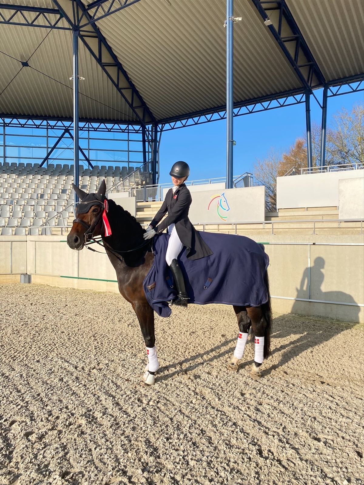 I dag, lørdag, gik den individuelle konkurrence MB2, hvor de 12 bedste ryttere kvalificerer sig til küren søndag. Jeg gav hende lidt mindre opvarmning, og det var en god plan, for hun gik en virkelig flot tur, og vi blev samlet nummer tre. Vi kom ind til en flot præmieoverrækkelse, hvor der var gulerødder til hestene. I det hele taget er der en rigtig god stemning hernede. Alle er megaflinke; dommere, TD’ere og staldpersonalet. Hestene står også opstaldet under rigtig gode forhold.