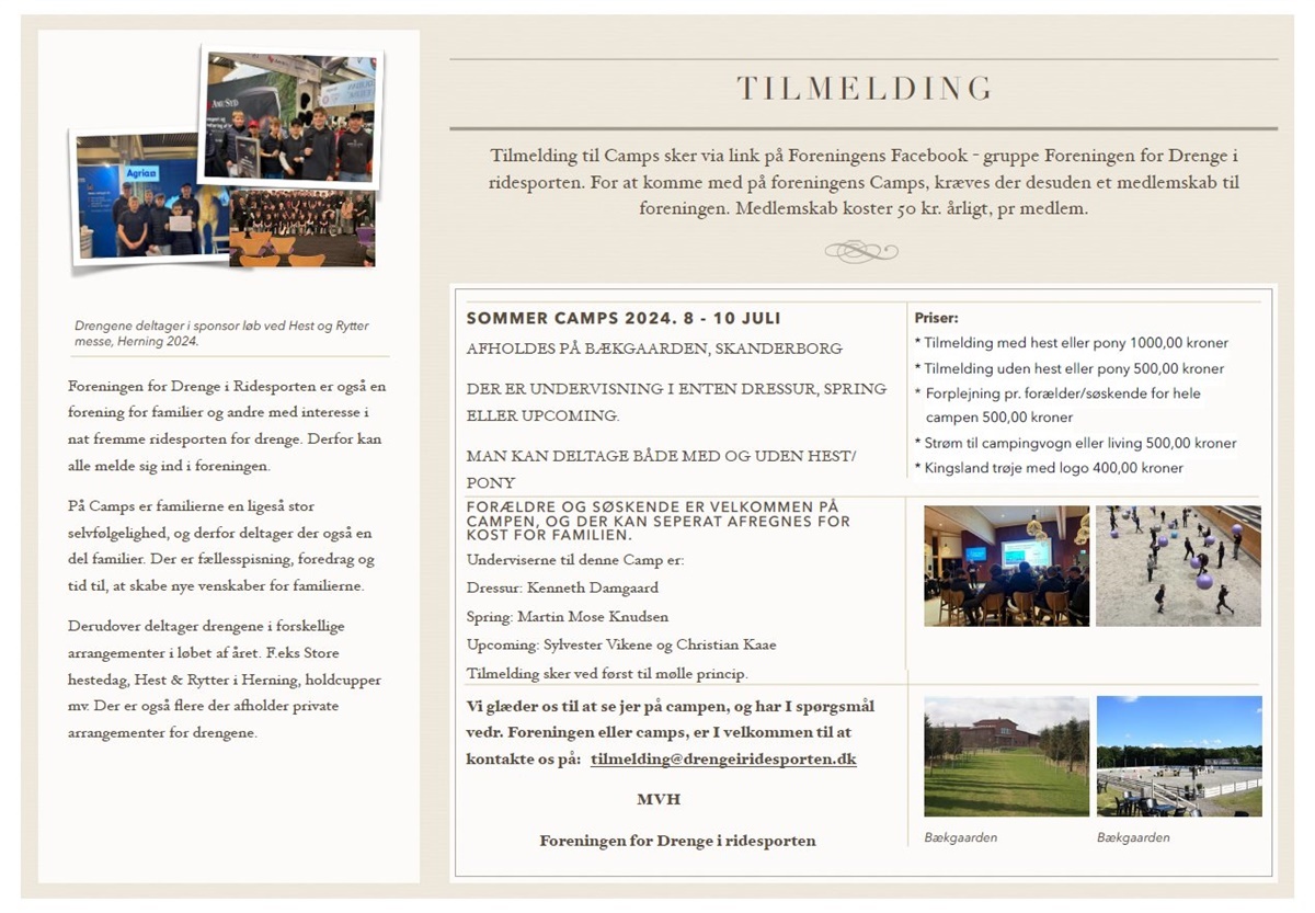Tilmeldingen foregår gennem Foreningens Facebookgruppe. Familierne er også velkomne på campen, skriver Drenge i Ridesporten på deres opslag.