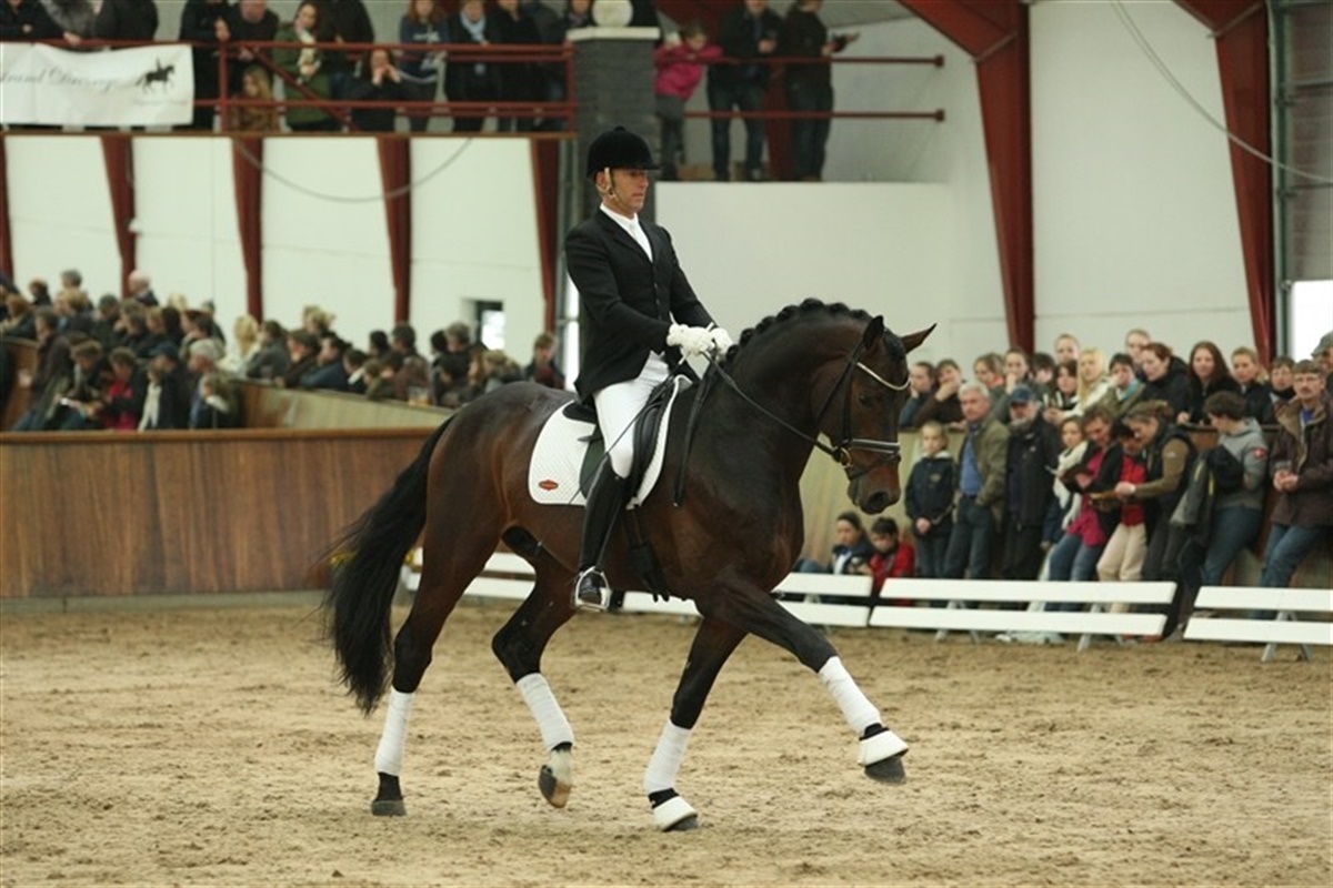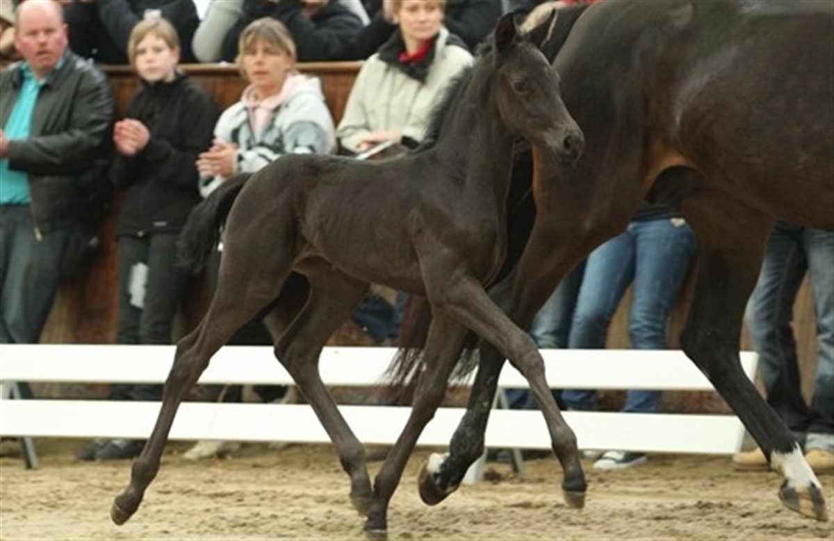 Neejjjj, publikum udstødte samstemmende et glædesråb da Ulrik Kristensen mønstrede sin far Eriks dejlige avlshoppe Valenta e. Blue Hors Romanov ind i hallen, det var dog ikke hoppen, som fik publikum op på mærkerne, men det skønne, elastiske hoppeføl, som travede taktfast og helt upåvirket rundt i hallen tæt på sin mor. Over flere omgange dansede føllet letfodet afsted, hele tiden op-ad-bakke og med ørene opmærksomt spidsede. Den tyske rytter, træner og uddanner Johannes Westendarp var tilstede for at fremvise Jens Peter Aggesens 4-årige avlshingst Belstaff e. Brentano II, og han spottede også det dejlige hoppeføl. Hendes mor Valenta er blot 5 år, men sidste år blev hendes første føl, Dancing Boy e. Dancier udnævnt til Årets dressurbetonede hingsteføl i Dansk Varmblod og efterfølgende solgt på elitefølauktionen for 155.000 kr. til Steffen Kristensen, Harlev J. Hoppeføllet fra i år er efter Soreldo, der sidste år blev udnævnt til fløjhingst i Dansk Varmblod. Hun er født den 24. marts, og hun skal blive i Danmark hos Lena og Ulrik Kristensen indtil hun kan vænnes fra i efteråret. - Føllet bliver registreret i Dansk Varmblod, og jeg er meget tilfreds med handlen og den pris jeg fik for føllet, fortæller Ulrik.