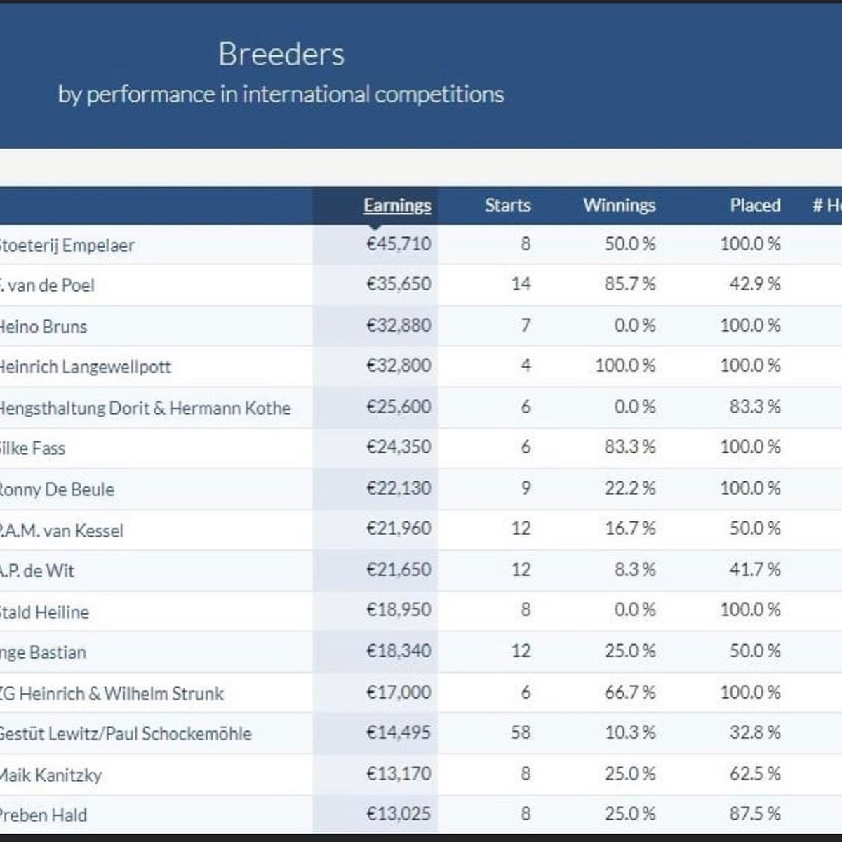 Den belgiske hesteportal Hippomundo laver blandt andet ranglister over sportsheste efter højeste indtjening i pengepræmier, og tilsvarende ranglister over avlerne, der har opdrættet disse.