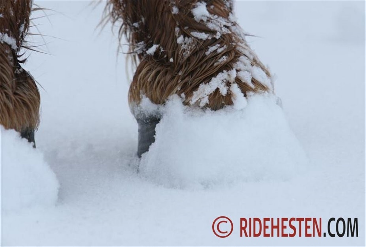 Det er mere behageligt for hesten at gå på sne end på den bare frosne jord, så hvis der er sne, så rid hellere i det. Her skal du dog være opmærksom på, at der kan dannes store sneklumper under hestens hove, så den kommer til at gå på "stylter". Det er selvfølgelig ikke særlig rart for hesten at gå på sådanne klumper, og det kan også være farligt for dig som rytter, da hesten nemmere snubler. Ved at smøre et tykt lag hovfedt på hoven inden rideturen, kan du forhindre, at der dannes alt for slemme isklumper. Under alle omstændigheder er det en god ide altid at have en hovrenser med i lommen, når man rider på tur i snelandskabet. Så kan man altid tage de værste klumper af.