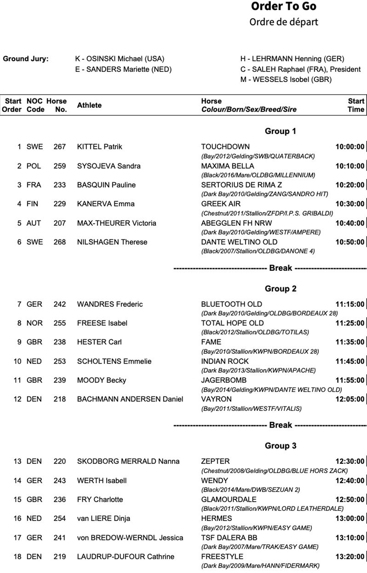 Der er blevet trukket lod i tre forskellige grupper, og det betyder, at Daniel Bachmann Andersen rider i anden afdeling, mens Nanna Skodborg Merrald og Cathrine Laudrup-Dufour rider i den sidste. Desuden lukker og slukker Dufour hele ballet, da hun rider på banen som den aller sidste dressurrytter ved dette OL.