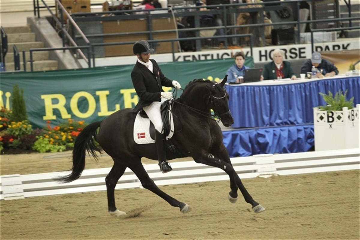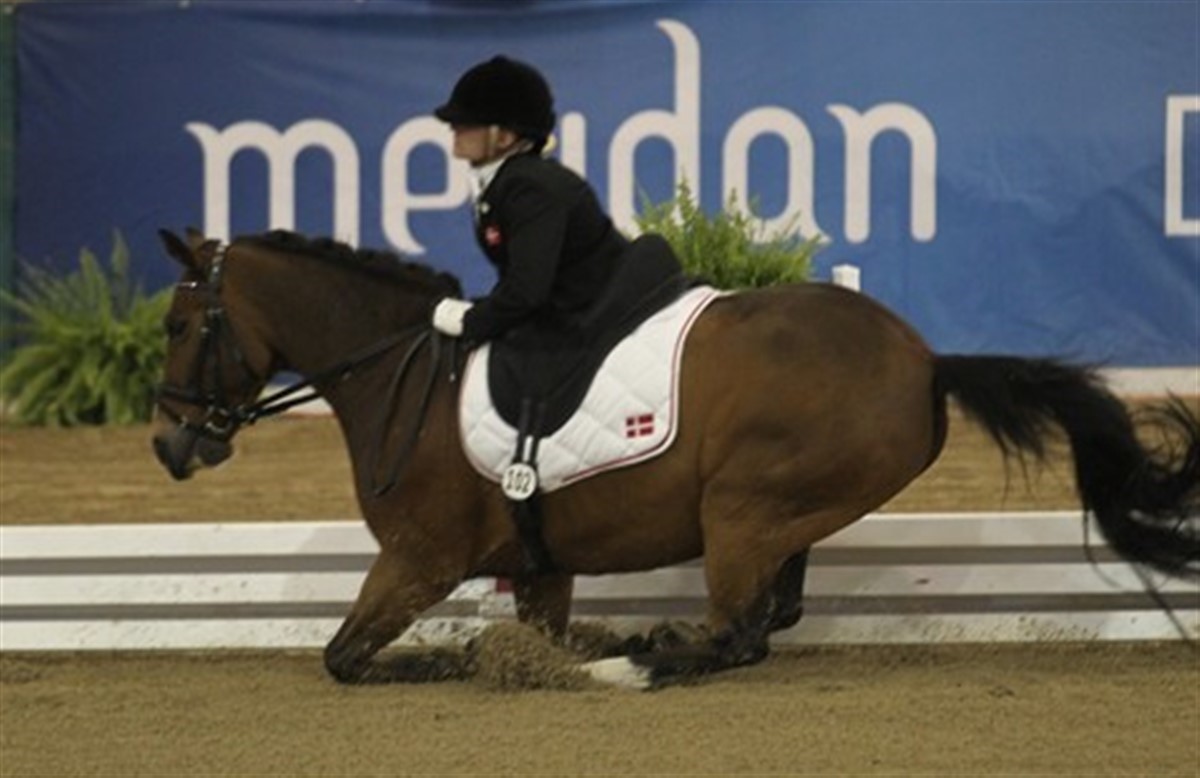 Publikum gispede da Labbenhus Snøvs pludselig snublede inde midt i et ellers meget flot program i para-dressur grad 1b. Snøvs gik helt i knæ og Stinna Tange Kaastrup blev kastet fremad i sadlen. Stinna har ingen ben, men holder balancen med sin overkrop i sadlen. Alligevel lykkedes det hende at blive i sadlen. Snøvs kom på benene og som den topprofessionelle sportsudøver Stinna er, så lykkedes det hende at ryste hændelsen af sig og fortsætte i programmet med at vise Snøvs spændstig, lydig og stillet og bøjet som voltesporet. Dommerne gav dem 68,636, hvilket rakte til en tredjeplads i klassen. Caroline Cecilie Nielsen og Rostorn's Hatim-Tinn e. Churchill viste et flot program i grad II, som dommerne vurderede til 66,476%. Der var en del uenighed om hendes præstation dommerne imellem - en dommer havde hende på 5. pladsen, to som nr. 11. Henrik Sibbesen var vældig godt tilfreds med sit ridt på Rexton Royal, der på trods af sine kun 7 år leverede et fejlfrit program, som dommerne vurderede til 68,5%, hvilket rakte til en tredjeplads i grad IV. Annika Dalskov og Preussen-Wind kom ind på andenpladsen med 70,593% i grad III, Annika var dog ikke helt tilfreds med sin egen indsats, og hun er topmotiveret for at gøre det endnu bedre i morgen. Det ser umiddelbart ud til at kampen om holdmedaljer kommer til at stå mellem Holland, Tyskland, England, Norge og Danmark. Rytterne fortsætter de individuelle og holdkonkurrencerne de kommende dage.