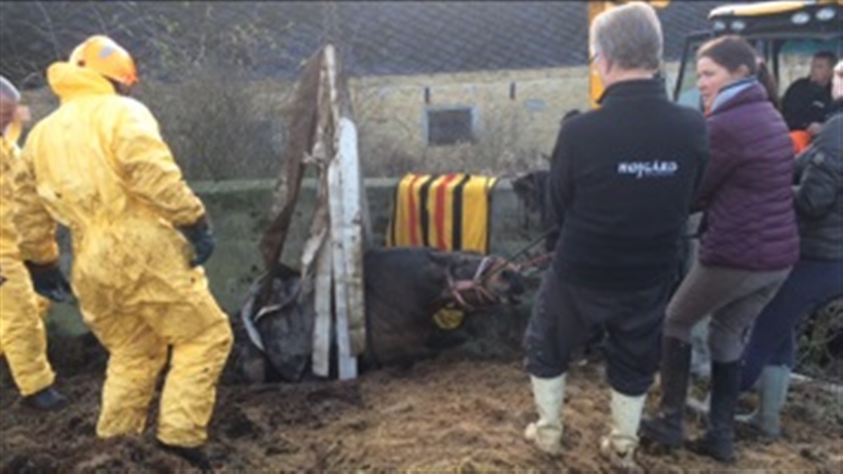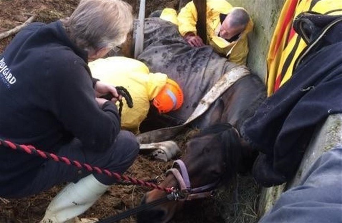 Hesten Nynne var uheldigvis endt i en gammel gylletank, hvor hun sad fast til bugen. Hun kæmpede forgæves for at komme fri.