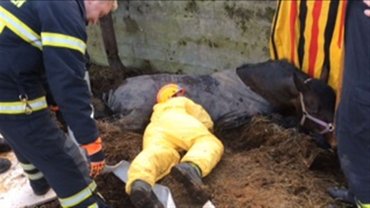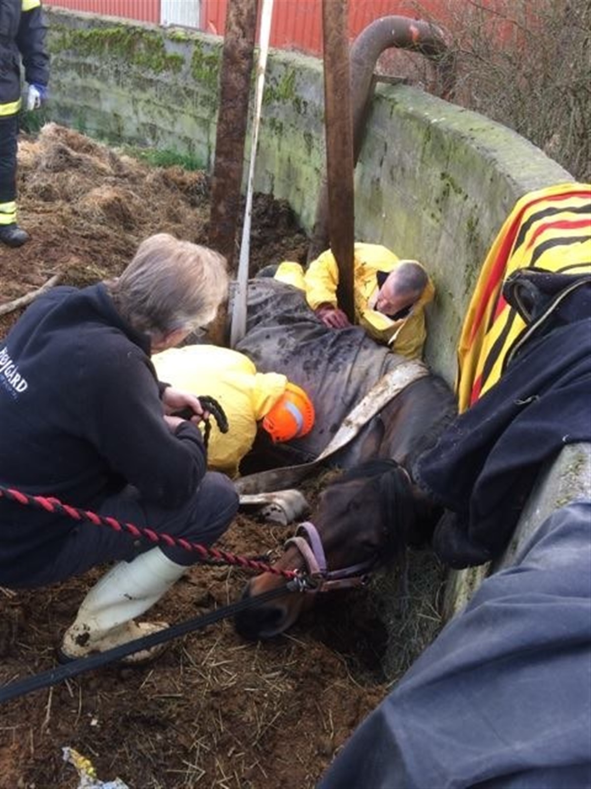 Falcks kran kunne ikke komme tæt nok på gylletanken, derfor måtte dyrlægen holde hesten bedøvet, alt imens Falck gravede sig ind under bugen for at lægge tykke brandslanger. Brandslagerne blev placeret bag forbenene og foran bagbenene. Det lykkedes, at få hesten hejst på sikker grund ved hjælp af en rendegraver.