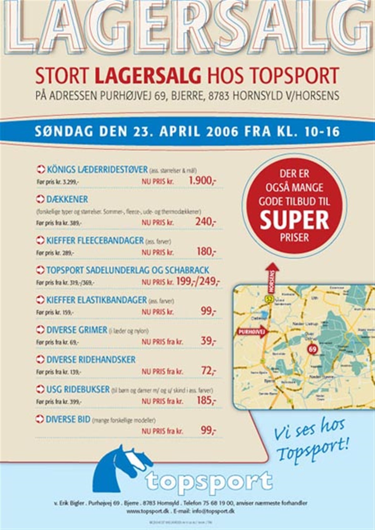 Nu er der mulighed for at få luftet spareskillingerne ved Topsports store lagersalg. En lang række produkter bliver sat på tilbud og der er derfor god mulighed for at gøre en rigtig god handel. Lagersalget finder sted på adressen Purhøjvej 69, Bjerre, 8783 Hornsyld ved Horsens Søndag den 23. april 2006 fra kl. 10-16.