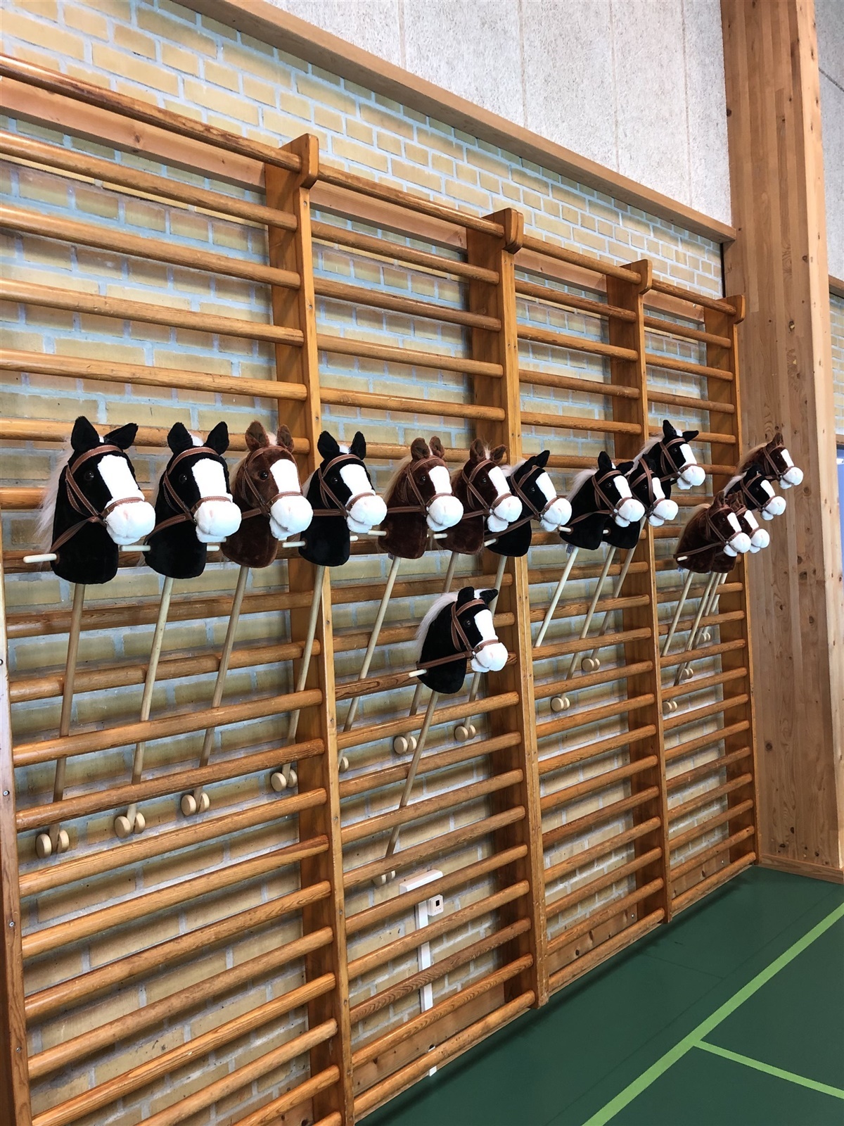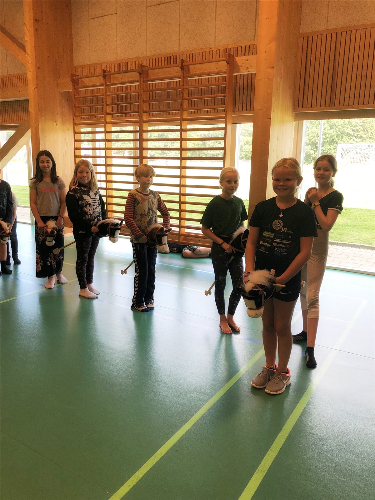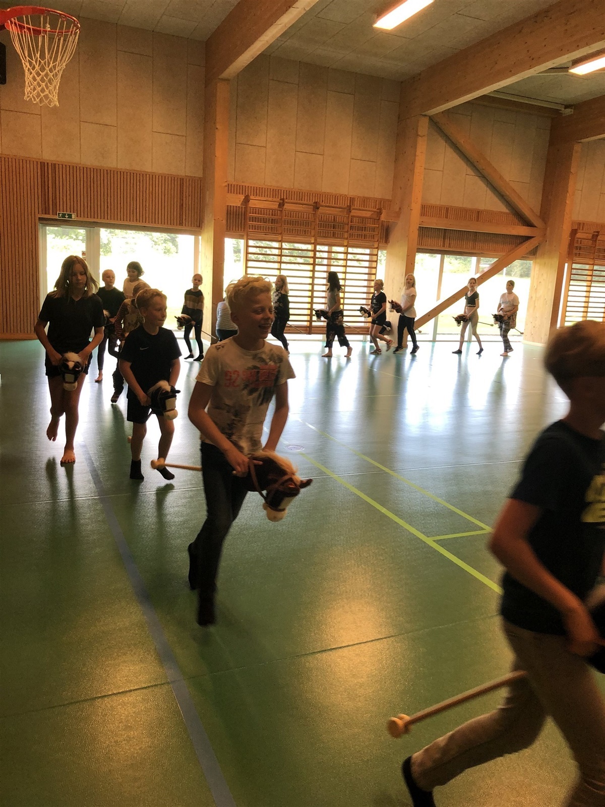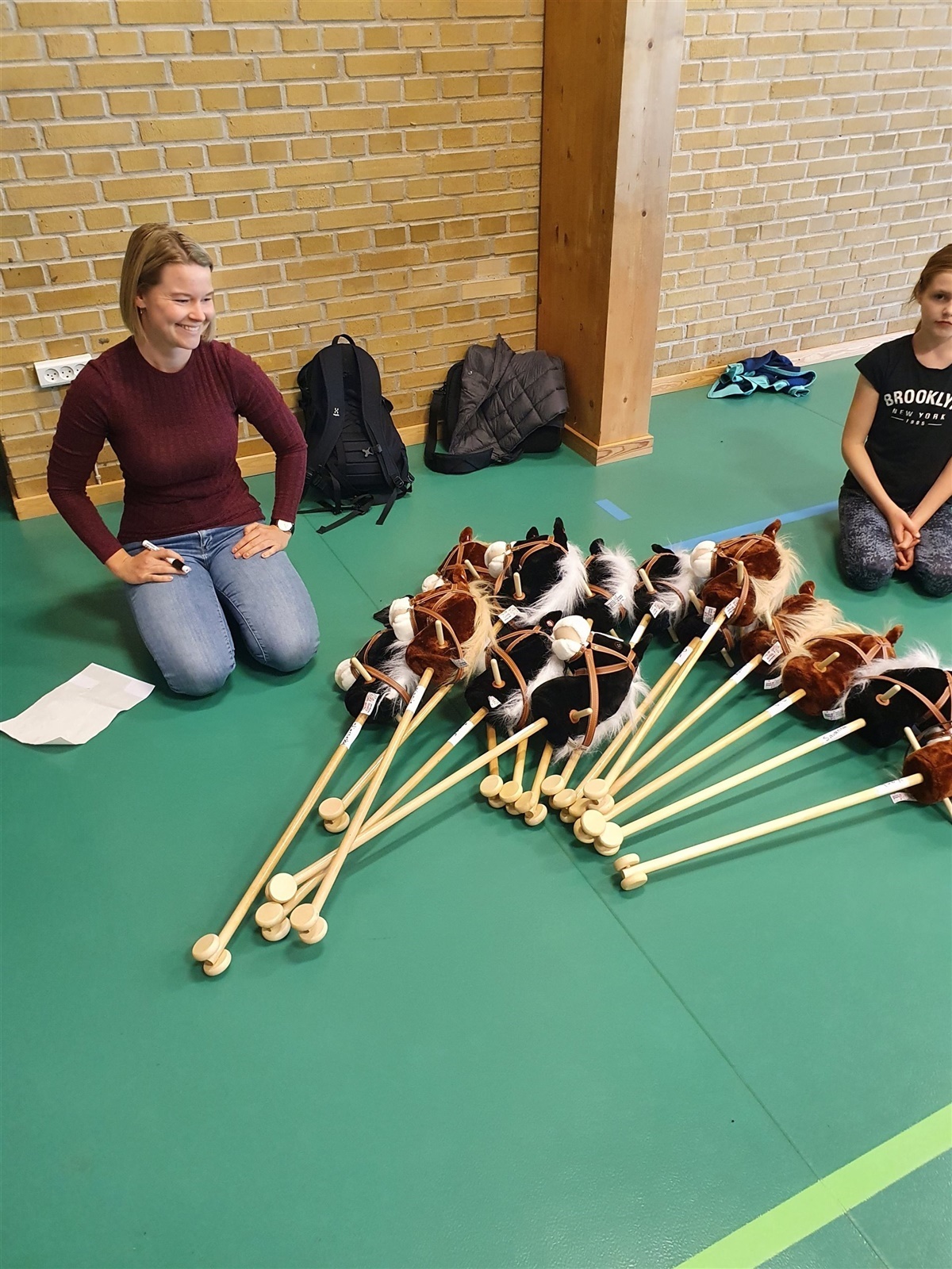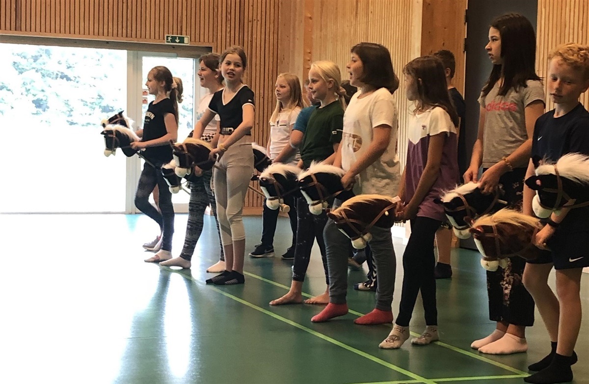 – I et forløb for seks gang har eleverne fra 4. klasse på Rødding Skole skiftevis været på Sdr. Hygum Rideklub, hvor de har lært om ridning og håndtering af heste og i gymnastiksalen på skolen, hvor de har redet kæpheste.