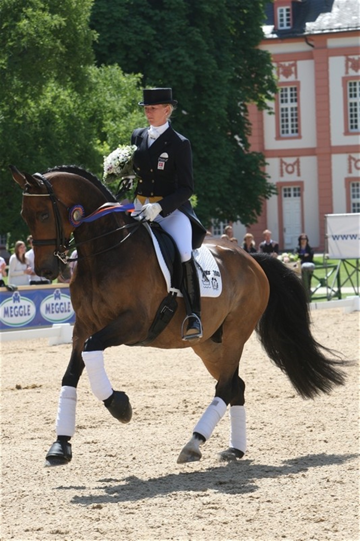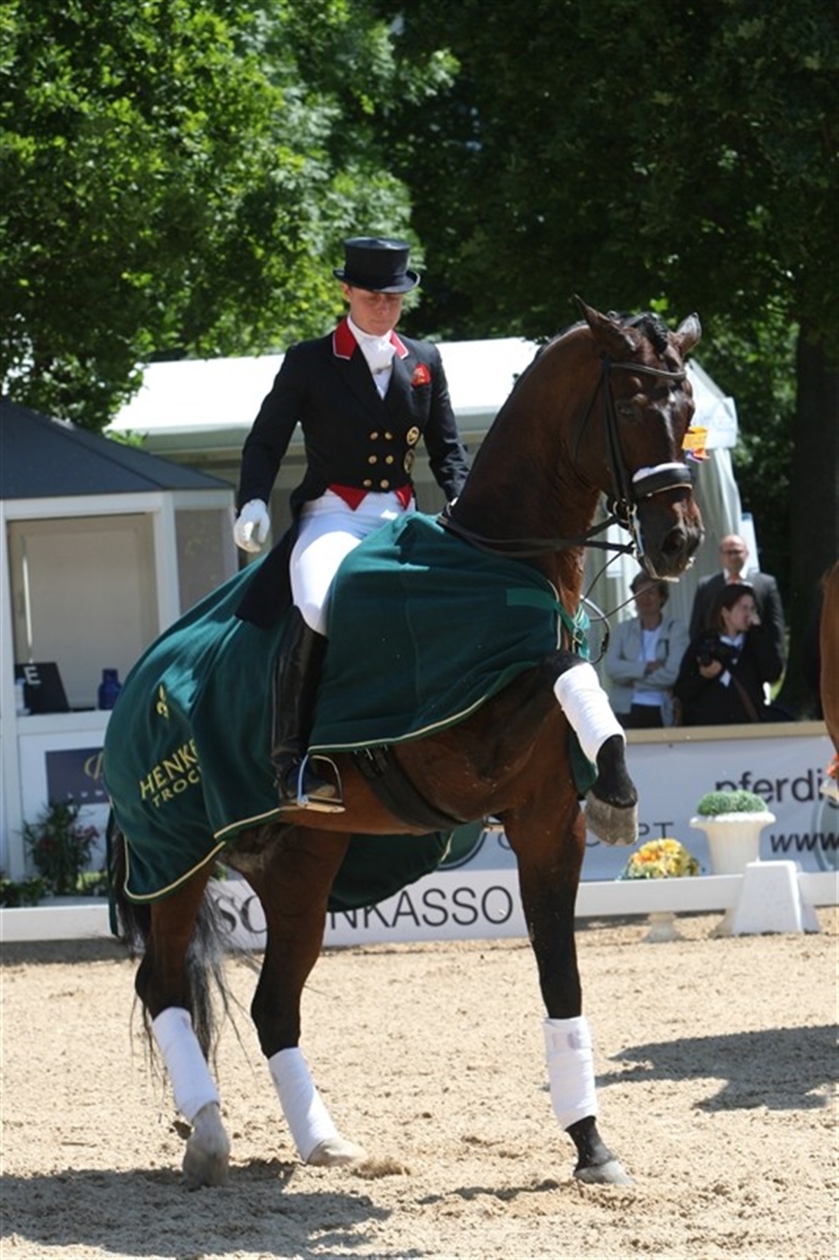 Nathalie zu Sayn Wittgenstein var meget tilfreds med hendes ridt på Rigoletto i dagens Grand Prix klasse, der kvalificerer rytterne til at ride i morgen aften i kunstigt lys. - Der var et par småfejl, hvor jeg mister nogle points, fortalte Nathalie efter klassen, der gav hende en andenplads med 70,723% til småfejlene talte en taktfejl i den ene øgning, en parade før tilbagetrædning, der ikke blev vist helt, som det står beskrevet i dressurbøgerne, forklarede prinsessen med et smil og i den ene piaffe begyndte Rigoletto at bakke en smule men uden at miste hverken takt eller løft. Bortset fra disse småfejl viste prinsesse Nathalie et flot trav og galopprogram med bl.a. gode changementsserier. Nathalie måtte se sig slået af Emma Hindle, der iøvrigt i lighed med prinssen træner hos Richard White. Emma lagde lidt afstand til sin danske kollega i dressurprogrammet, men satte points til i galopprogrammet, men ikke nok til, at prinsesse Nathalie kunne holde sin føring. Emma Hindle og Lancet fik 70,894% Læs mere om stævnet i Ridehestens juli nummer.