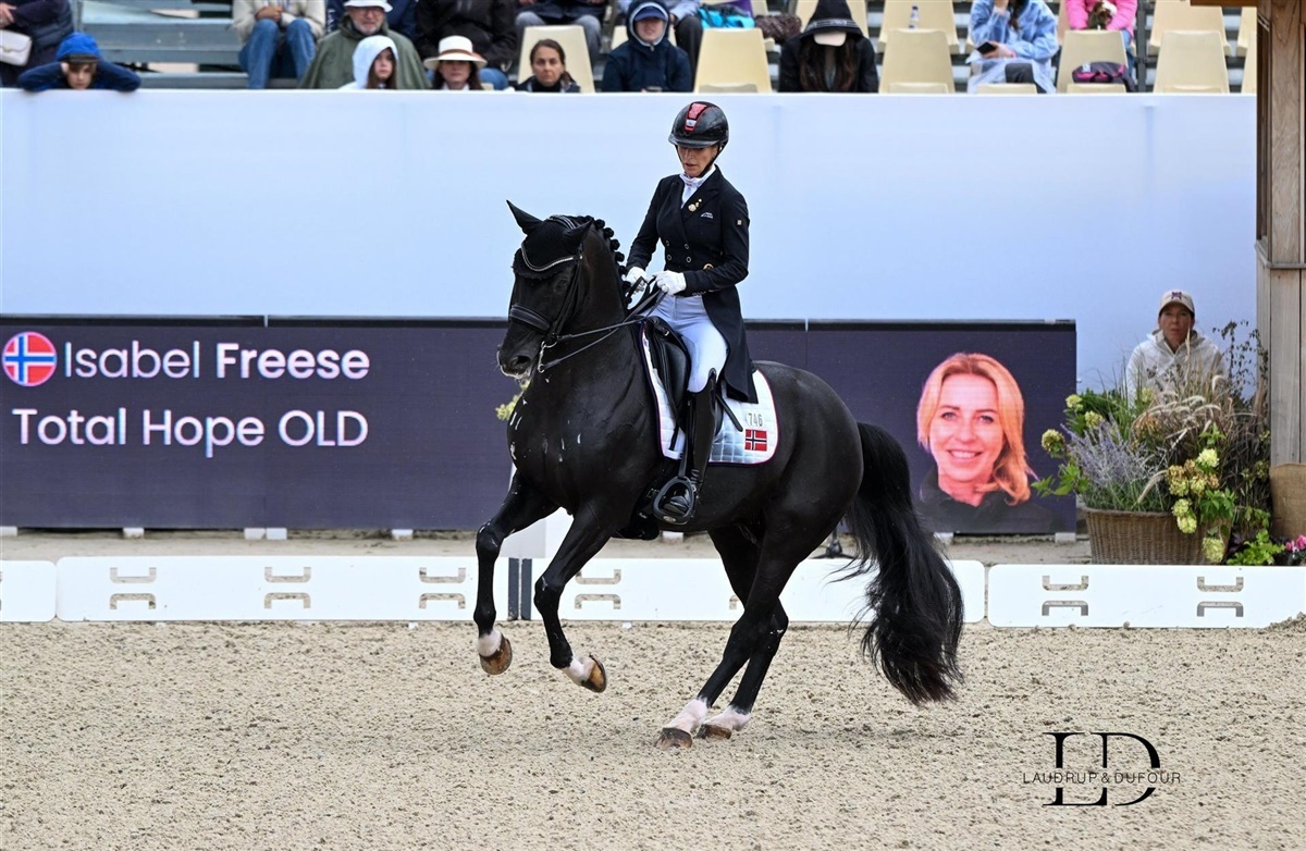 Den 46-årige norske Isabel Freese har netop været på banen med den danskejede Total Hope OLD e. Totilas/ Blue Hors Don Schufro, som ejes af danske Lone Boegh Henriksen fra HP Horses i samarbejde med Paul Schockemöhle og norske Oiwind Bache. Parret er eneste ekvipage fra Norge, der har formået at klare sig videre til Grand Prix Special efter de i går red et virkelig vellykket og flot program.