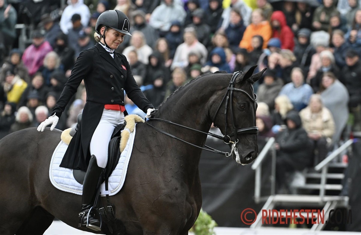 Cathrine Laudrup-Dufour har netop været på banen som sidste rytter for Danmark i sadlen på Mount St John Freestyle e. Fidermark/ Donnerhall II - ekvipagen der ikke behøver nærmere introduktion. I dag startede de fuldstændig fantastisk ud i travprogrammet, hvor kommentatoren da også nævnte, at man skulle tro, at Free har fjedrer i skoene. Hoppen bevæger sig så let og elegant henover banen, og Cathrine formår at ride så harmonisk rundt for helt lette hjælpere.