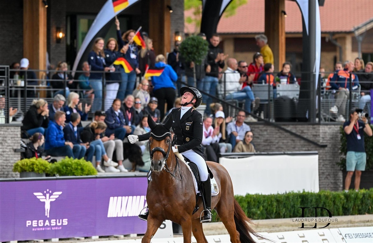 Første danske ekvipage på banen i dag var 54-årige Rikke Dupont og Grand Galiano e. Grand Galaxy Win/ Blue Hors Don Schufro (opdr. Lotte og Gert Buchhave). Rikke og den 10-årige DV-vallak indfriede ved sommerens CHIO i Aachen for alvor deres potentiale, som er i tråd med den udvikling, der har været, siden de i 2022 blev en del af DRF’s perspektivgruppe. På baggrund af Aachen-resultaterne blev Rikke en del af A-gruppen og for første gang udtaget til at repræsentere Danmark ved et stort, internationalt mesterskabsstævne, hvilket de gjorde rigtig flot i onsdagens Grand Prix.