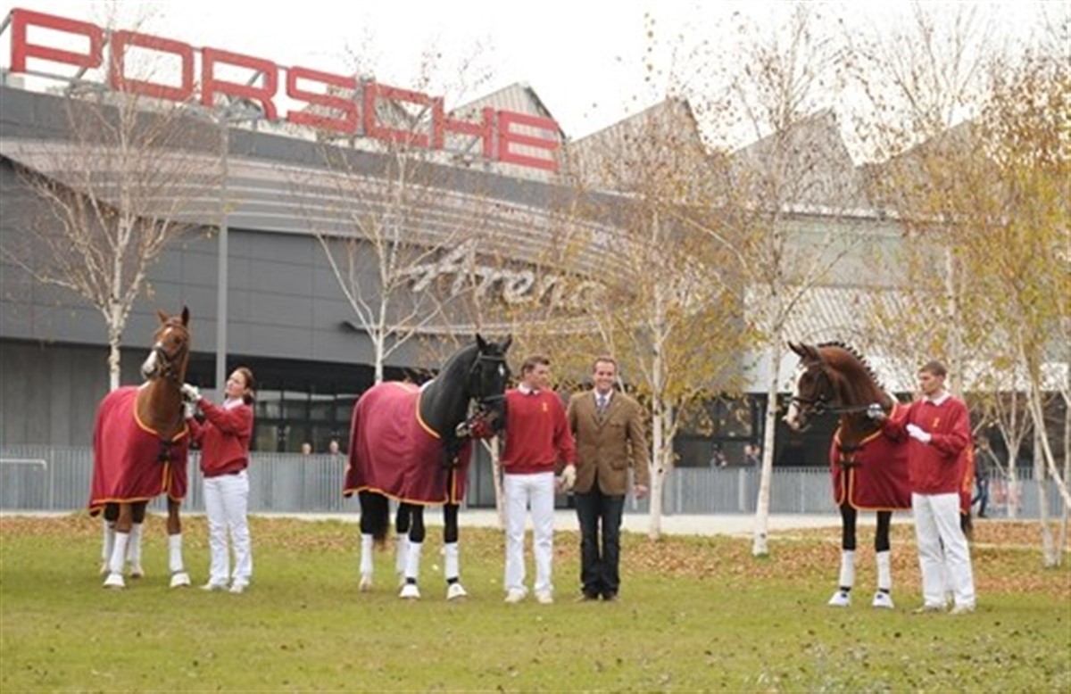 I dagene 26.-28. januar afvikles Süddeutsche Hengsttage 2012 i München-Riem. Mange vil huske sidste års kåring for de to fløjhingste Captain Kirk og Sandbrink. I år udgøres kollektionen er dressurbetonede hingste bl.a. af 4 sønner af Don Diamond, 3 Quaterback, 3 Swarovski, 2 Lord Loxley og 2 Diamond Hit. Blandt de springbetonede kan man forvente at se 3 sønner af Diarado, 3 Coronas og 2 sønner af Quidam de Revel. Billedet er taget ved Stuttgart German Masters, hvor der blev præsenteret seks af kollektionens unge hingste.