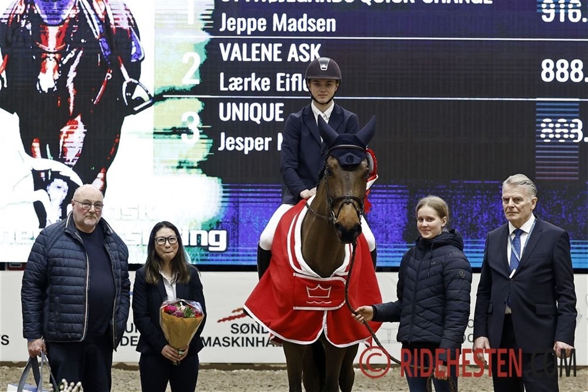 Syvhøjegårds Quick-Change med egen rytter Jeppe Madsen, endte med samlet 916,25 point, og som de eneste over 900 point i årets championat, var det en sikker sejr. Jeppe er ikke en rytter med meget erfaring fra store stævner, han har redet en del ungheste, men han fortæller, at det var en stor oplevelse af vinde og at det har givet blod på tanden til at opnå mere. Hør interviewet med Jeppe nedenfor.
