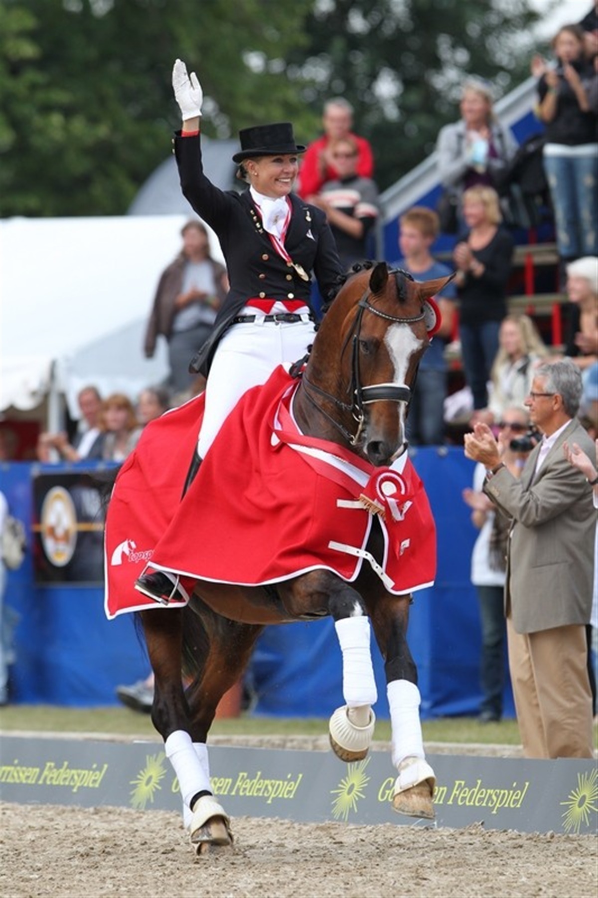 Publikum stod tæt omkring dressurbanen på Broholm og de var medvirkende til at skabe en fantastisk kulisse omkring mesterskabet. Alle 15 ryttere i kürfinalen havde sammensat interessante programmer, og selvom der indløb nogle fejl så viste samlige ekvipage også nogle højdepunkter, så publikum fik lejlighed til at klappe dem ud af banen med begejstring. Forud for dagens kür lå Anne Troensegaard og Seduc i front 0,44 points foran Anne van Olst og Clearwater. Sune Hansen og Blue Hors Romanov lå på bronzepladsen godt et points efter de to kvinder. - Planen var at jeg skulle risikere hele butikken i dag, sagde Sune Hansen med et bredt smil efter dagens kür. Jeg ville gå efter guldet, og Romanov føltes helt klar og med mig på opvarmningen. Men da Sune red Romanov ind i en piaffe ud mod det talstærke publikum på græsplænen, stivnede hingsten, og så var løbet kørt for Sune, der havde sit hyr med at få hingsten rundt på banen. Han var simpelthen blevet bange og utryk, og det kostede værdifulde points. Med 63,90% i dagens kür var Sunes bronzemedalje pludselig i fare, for Kristoffer Mejlhede og Kildevangs Mignon havde redet sig tæt på Sune med et meget flot og dynamisk kürprogram. Kristoffer fik ialt 203,59 points mod Sunes 203,62 points, så Sune genvandt sin bronzemedalje. Anne Tronsegaard vidste, at hun ikke kunne tåle at få fejl i dagens kür, men Seduc, der er meget sensibel, blev lidt for spændt i dag og der indløb fejl i serierne. Anne Troensegaard fik i dag 74% i kraf af meget høje points for det kunstneriske indtryk, og hun fik samlet 215,47 points. Så var presset på Anne van Olsts skuldre. Hun og Clearwater fik vist dynamisk passage, fine piaffer, flotte serier, og da Anne red op mod dommerne i slutningen af sit program i travers i passage, begyndte publikum spontant at klappe. Anne kunne forlade banen med publikums jubel rungende i ørerne og et stort smil på læben, sidste års sølvmedalje blev skiftet ud med en af guld