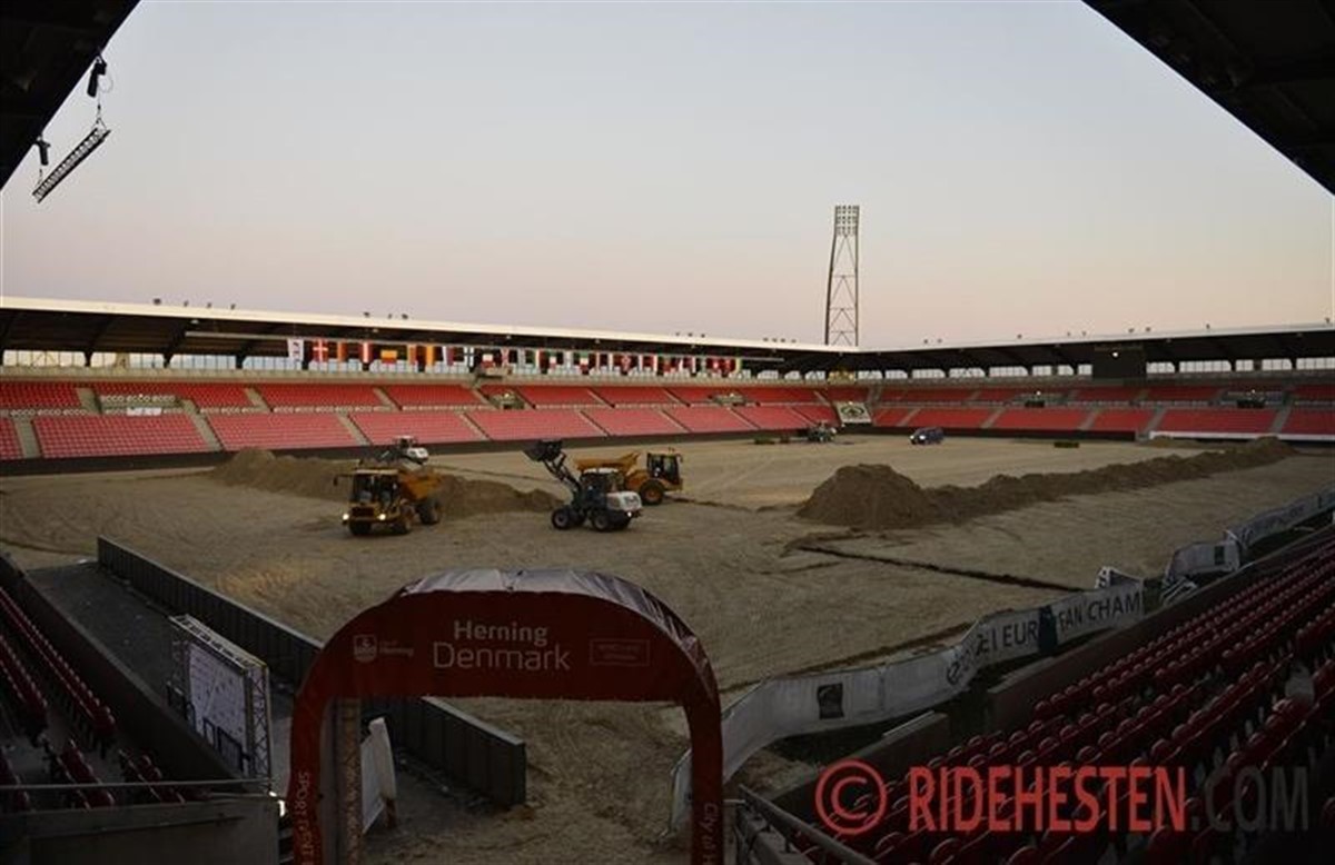 Sidste fredag aften rykkede lastbiler og gravemaskiner ind på MCH Arena – 8100 gummimåtter og 1300 kubikmeter sand blev fordelt udover FC Midtjyllands fodboldbane, og næste dag var den imponerende ridebane klar til at tage i mod de mange EM-deltagere.
