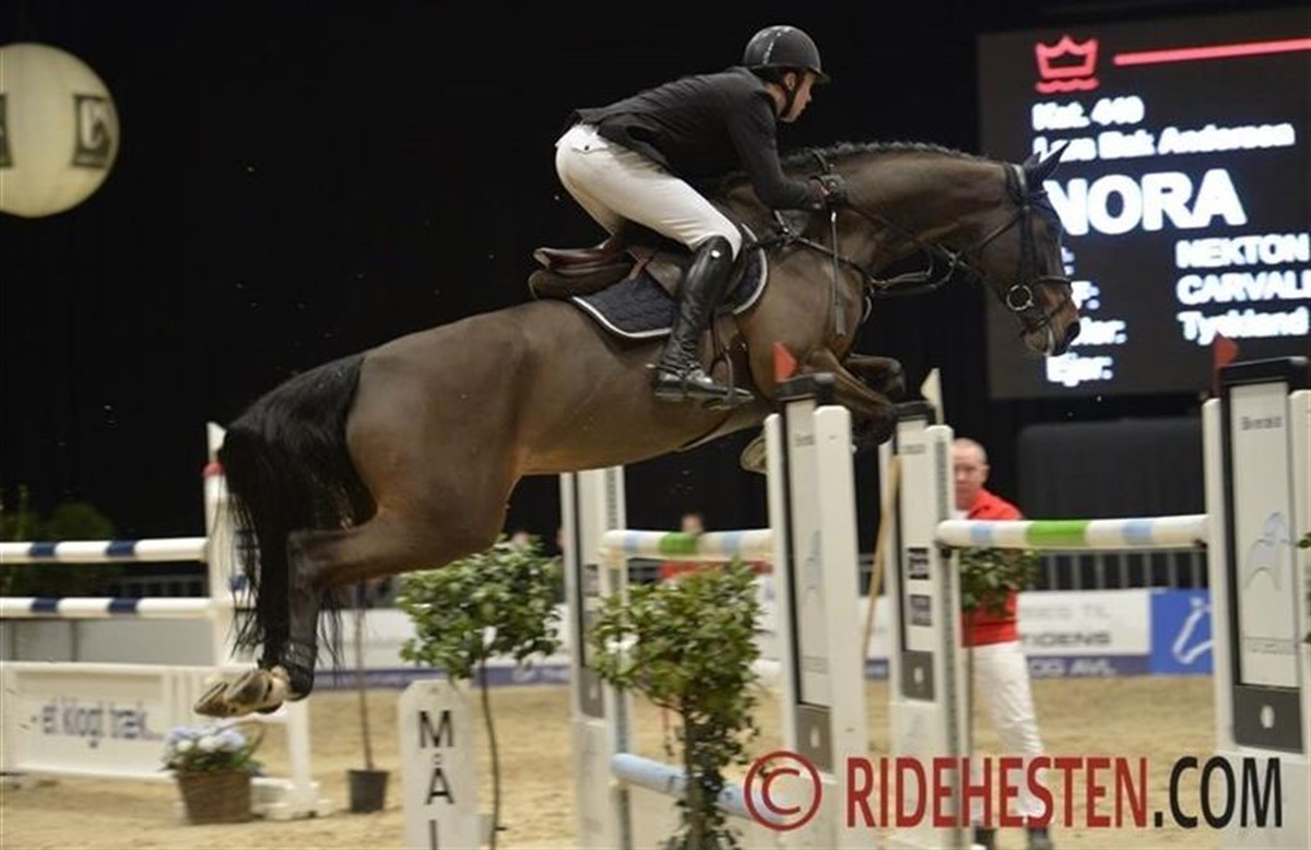 Det var indtil klassens andensidste ekvipage, testrytter i Katrinelund Unghestechampionat, Lars Bak Andersen, kom på banen på Nora e. Nekton/Carvallo og i sikker stil med stort overblik satte Nora i gear og sprang sig til en fejlfri runde i tiden 51,58 sek., og dén præstation blev ikke overgået.