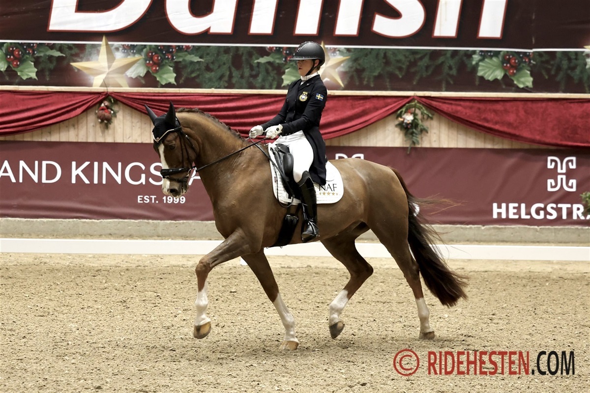 Bedst af alle blev gårsdagens tredjeplads, nemlig Theresa Rosenkilde på DV-vallakken Blue Hors Zwobber e. Blue Hors Zack/ Romanov (opdr. Blue Hors ApS). I går kunne hun dele podiet med sin søster, Margaretha Rosenkilde, men i dag fik hun det altså for sig selv, da hun med en flot kür sikrede sig 71,367% og altså en flot julesejr som afslutning på det internationale stævne på Vilhelmsborg.