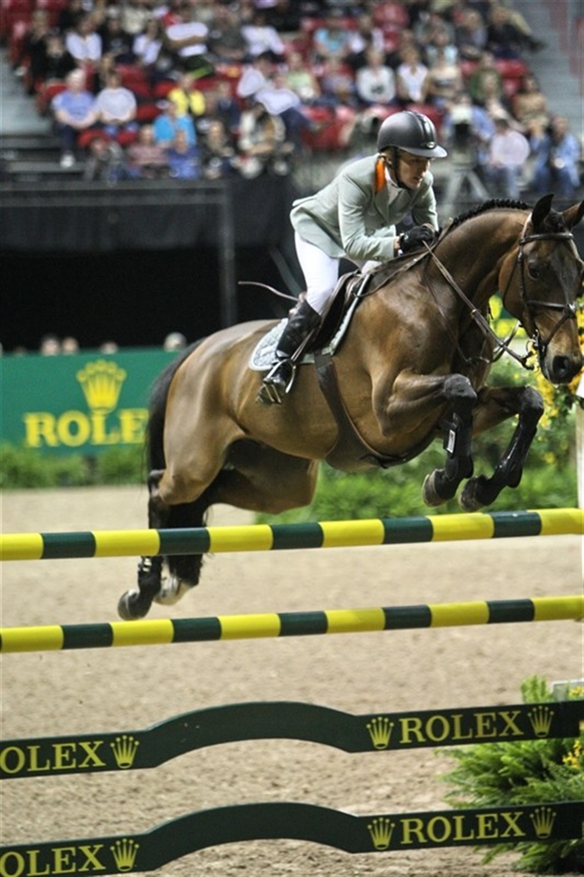 - Han sprang vanvittig godt, sagde Thomas om hingsten Grim St. Clair, parret var fejlfrie i hovedspringningen i dagens World Cup afdeling i Las Vegas. Thomas kom i omspringning sammen med 12 andre topryttere, og han valgte at satse på en god tid. Det var lige ved at lykkes for ham, men en enkelt forhindring, en stor Rolex lodret ud af en snæver vending, fik Thomas ikke timet helt perfekt og det kostede nedslag. Han sluttede på en 10. plads, og med femtepladsen fra første dags tidsspringning, kan han nu imødese hviledagen med 7 World Cup fejl (point omregnes til fejl), hvilket giver ham en delt femteplads inden søndagens to afgørende runder i World Cup finalen. - Nedslaget kommer ikke til at betyde noget, forklarer Thomas, der er mindre end to nedslag fra førstepladsen. Forud for World Cup finalen havde han udtalt til Ridehesten, at han ville være glad for en finaleplads og super tilfreds med at slutte i top ti. Det ønske kan meget vel gå i opfyldelse på søndag i Las Vegas. Meredith Michæls-Beerbaum kom på banen i omspringning som klassens sidste rytter. Før hende havde de amerikanske ryttere Mclain Ward, Beezie Madden og Richard Sponer vist stor klasse med fejlfrie og hurtige runder. Albert Zoers Oki Doki er kommet til Las Vegas i topform, og han kilede sig i dag ind på en tredjeplads efter Mclain Ward og Sapphire. Meredith red på banen med Shutterfly, og deres gennemridning af omspringningsbanen var lige efter lærebogen, og da hun red over målstregen et sekund hurtigere end amerikanerne, tangerede det en magtdemonstration fra rytterens side.