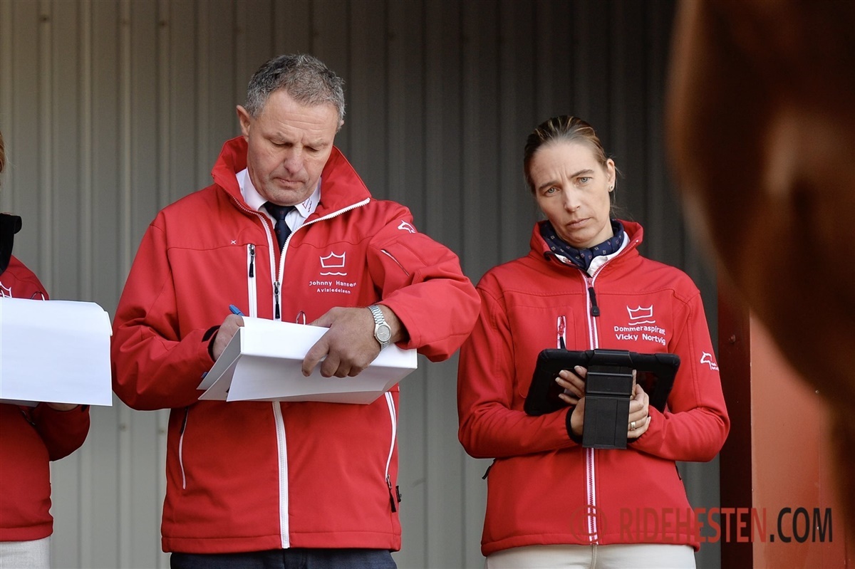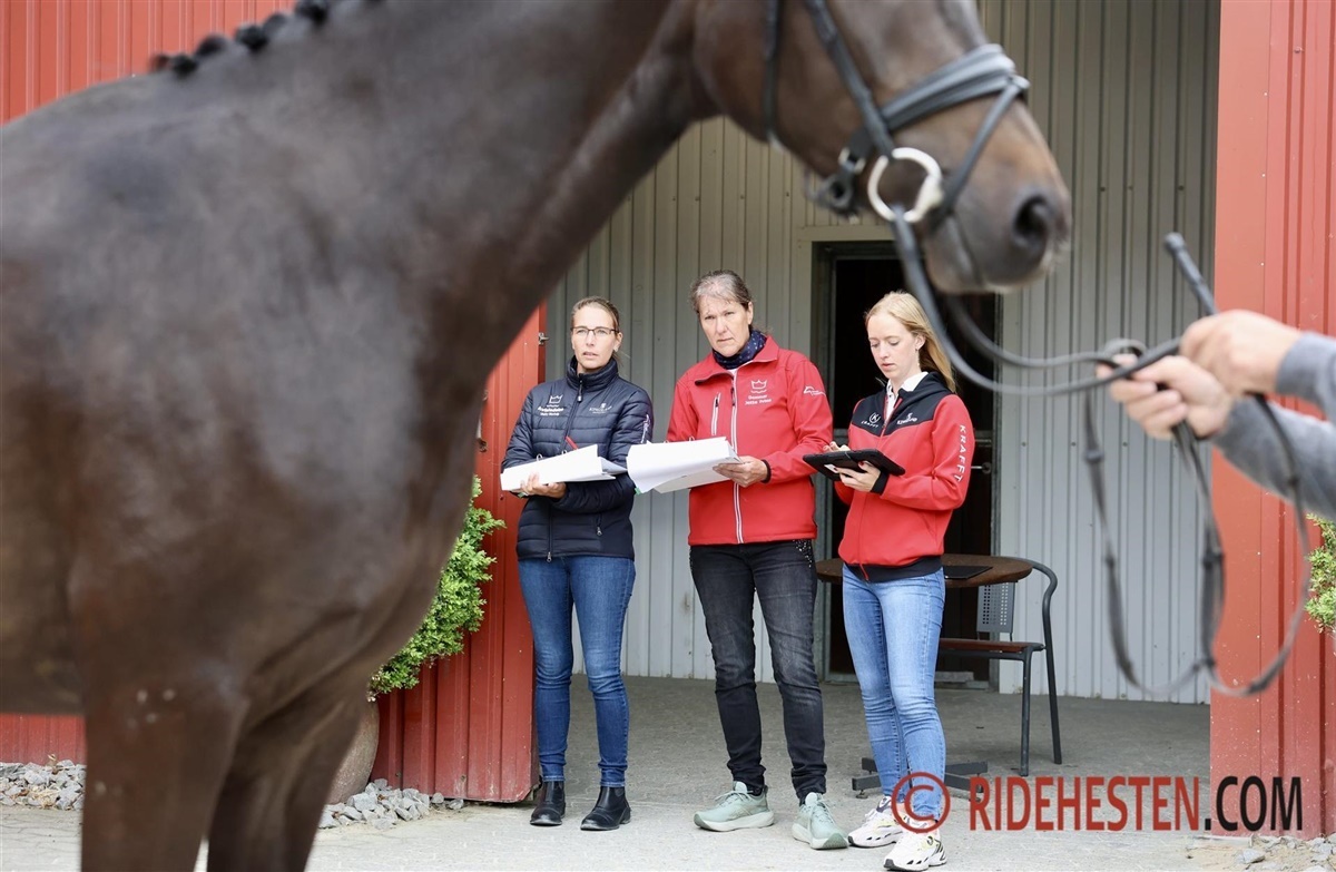 Det er de to springhopper, som først skal til bedømmelse. De bliver løssprunget og skal senere gå rideprøve under deres daglige rytter. De otte dressurhopper, der skal bedømmes vises i gangarter under daglig rytter.