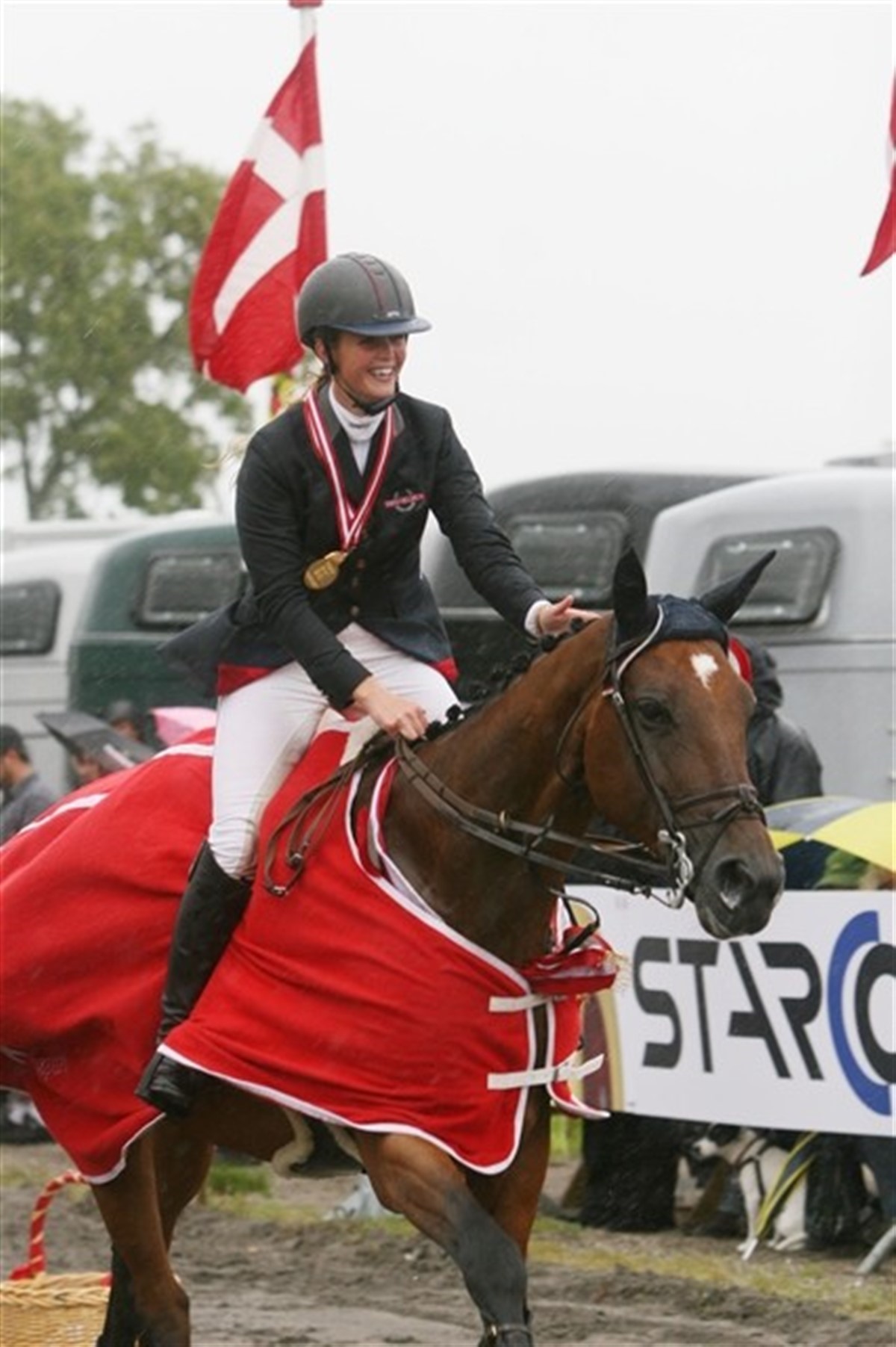 Tredje og sidste afdeling af Danmarksmesterskabet i ridebanespringning blev i dag redet på Det Nationale Hestesportscenter Vilhelmsborg. Den forsvarende mester Tina Lund, der i år red på hoppen Zamiro opdrættet af Jens Trabjerg førte inden dagens konkurrence med nul fejl foran Michæl Aabo der havde 6 fejl med sig. Det betød at Tina skulle rive 2 forhindringer mere end Michæl for at bringe titlen i fare. For de fleste tilskuere så det ud som om, at mesterskabet var i hus, men Tina mente selv at banebygger Peter Vogt, havde lavet en svær bane der lagde alt åbent. Rytterne skulle ride to runder og Tina Lund og Zamiro lagde igen skarpt ud med en fejlfri runde. Tinas 5. nul-runde i mesterskabet i øvrigt. Michæl Aabo og Mosegårdens Dilight holdt stillingen og red en fejlfri runde. Sidste og afgørende runde ændrede ikke på resultatet i toppen og den ene bom som Zamiro rev på næstsidste forhindring blev også hoppens eneste i mesterskabet. Inden præmieoverrækkelsen blev Zamiro’s helsøster i øvrigt præsenteret med et føl ved siden. Det dejlige føl efter Godsend du Reverdy, som Thomas Velin blev dansk mester på i 2003, blev aften før solgt på Dansk Varmblods følauktion for en hammerslagpris på 175.000 kr. Spring generne er i orden, men om der er en ny springstjerne på vej vil tiden vise. Zamiro selv er i øvrigt avlet af Jens Trabjerg, der red moderen i S-springning og siden satte den i avlen. Vejrguderne har ikke været gavmilde denne sommer og skyerne har da også hængt over stævnepladsen flere gange, men alle DM runder er indtil videre blevet afholdt i tørvejr og fin sol. Sidste runde var heldigvis ingen undtagelse, men alt det regn som vejrguderne syntes at have holdt tilbage faldt tilsyneladende da præmieoverrækkelsen gik i gang. Den meget regn kunne dog ikke tage smilet af den nykårede danske mester, der kan skrive sit 3. mesterskab i træk på visitkortet. Lidt værre var det dog for arrangørerne der fik en ekstra opgave med at trække fastkørte lastbiler fri fra stævnepladsen. 1: Tina Lund, Zamiro 2: Michæl Aabo, Mosegårdens Dilight 3: Søren Møller Nielsen, Bøgegårdens Apollo 4: Thomas Jensen, Bronson Linnea Ericsson, Cordivo Torben Frandsen, Alcamo Vogt 7: Mette Vandet, Casal 8: Charlotte Lund, Rosina Mosebo 9: Allan Skov Christensen, Rubber Ball 10: Carsten Gannerup, Liwe Star