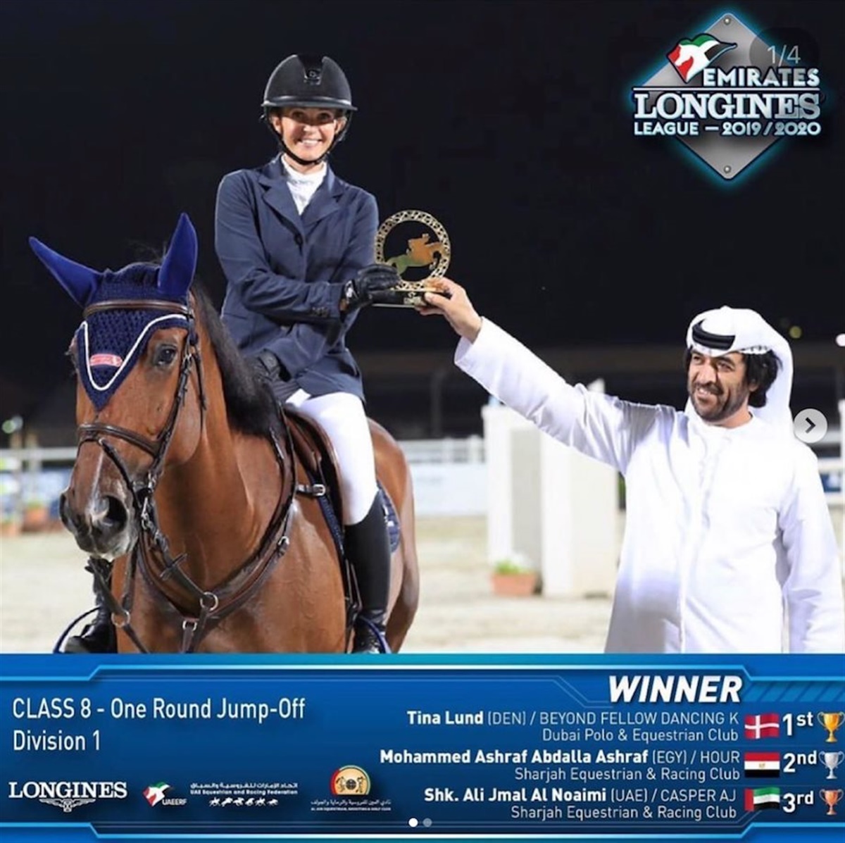 Fredagens 145 cm-klasse ved springstævnet i Al Ain blev vundet af danske Tina Lund, som har base i de Forenede Arabiske Emirater. De fire bedste ryttere havde fire fejl i første runde, og heriblandt var Tina Lund på den danskopdrættede Beyond Fellow Dancing e. Party Dance/Ulrich Z (opdr. Linda Neumann og Frank Torndyb). I omspringningen var hun fejlfri og vandt klassen med tre sekunders forspring til egyptiske Mohammed Ashraf Abdalla Ashraf på andenpladsen.