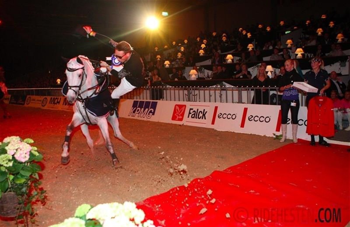 Her er et eksempel på hvor hest og rytter ikke er helt enige om retningen. Andreas Schou havde forestillet sig atde skulle springe over den røde løber, Chicago var ikke af samme opfattelse.