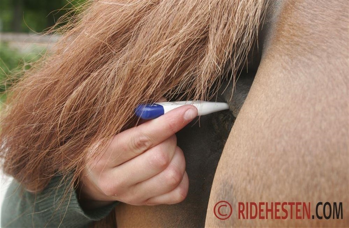 Hestens temperatur tages i endetarmen, da det er mest nøjagtigt – køb et digitalt termometer på apoteket.