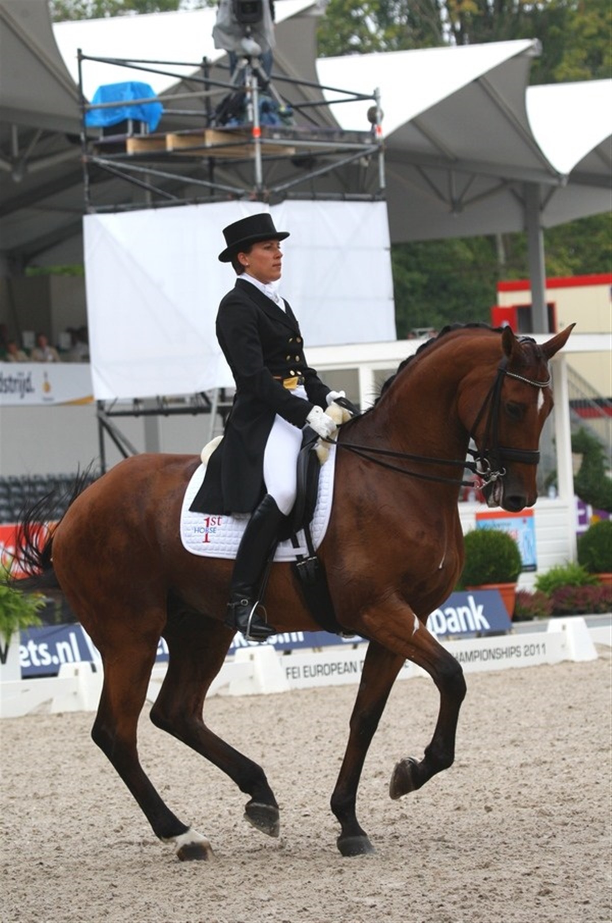 Inden middagspausen har 16 ryttere af de i alt 65 startende været på banen. Lisbeth som startede som klassens første rytter red - trods den ulempe det er at ride først - op til sit bedste, og viste endnu en gang, hvor nervestærk hun er ved at ride et ubesværet og fejlfrit program, som blev honoreret med 69,970 %, hvilket foreløbig rækker til en sjette plads. Anne van Olst følger lige efter på syvendepladsen med 68,632. Ikke helt uden spændinger men med piaffe-overgange og passage samt galoppirouetter, som det absolutte højdepunkt. Dårlige parader, især indledningsparaden have kostet nogle kostbare point. Formiddagens helt store oplevelse var debutanten på det engelske hold, Charlotte Dujardin på kun 9 årige Valego efter Negro. Det var en ren demonstration af ”en glad og tilfreds atlet”. Bortset fra en lille uoverensstemmelse i den anden piaffe, og en moderat fri skridt, så var der ikke noget det charmerende par ikke kunne til topkarakterer. Det var så ubesværet og harmonisk med en hest der havde lukket mund og rolig hale og med største selvfølgelighed udførte selv de sværeste øvelser. Selv om Charlotte Dujardin foreløbigt fører klassen stort med 78,617 foran en overbedømt Christof Koschel med Donnperignon fra Tyskland, så var dommerne tilbageholdende med deres karakterer. Det var et ridt til mere end 80%. Klassen fortsætter i eftermiddag, og i morgen følger anden del, hvor de bedste ryttere fra de 16 hold skal kæmpe om medaljerne. England, som var spået en favoritrolle ved disse mesterskabe,r ligger mere end lunt i svinget med to superryttere tilbage, Laura Bechtolsheimer med Mistral Højris og Carl Hester på den bedårende Uthopia.