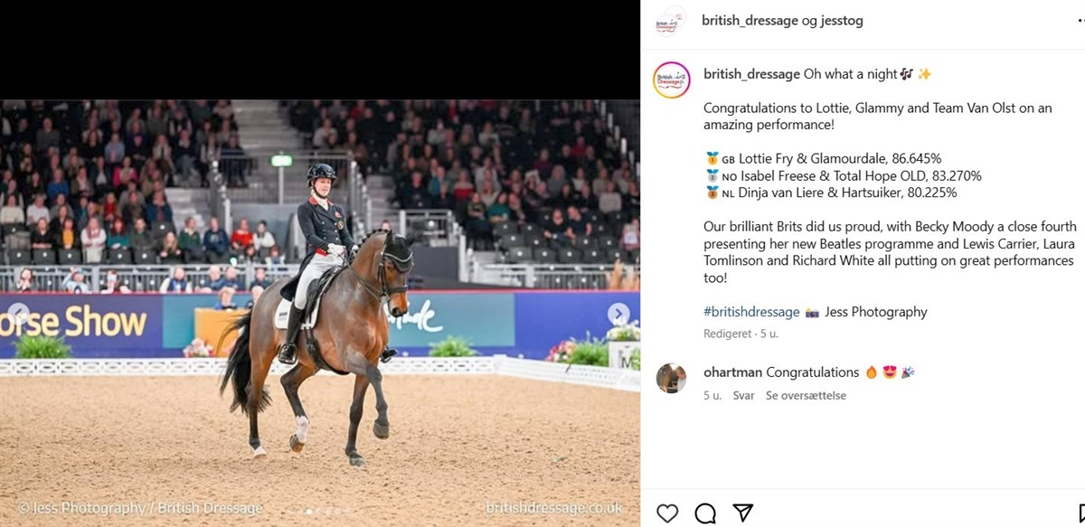 – Det var første gang, jeg havde muligheden for at dømme Laura på denne hest. Vi delte alle det samme indtryk – vi kunne lide ham. Han er en smuk type og er særdeles korrekt i sine bevægelser. Han efterlod et fantastisk indtryk. Det er tydeligt, at han er en hest, der stadig er under udvikling, men han har allerede tre gode gangarter. Han er veluddannet og viser talent for de svære øvelser, siger Stephen Clarke til Horse and Hound.