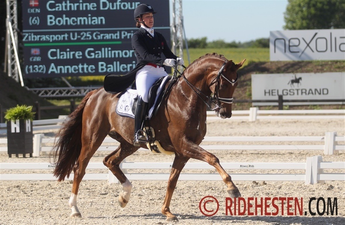 I en stærkt belagt Nordic International Sales Prix St. Georges med 25 starter viste den debuterende ekvipage, Cathrine Dufour og Bohemian e. Bordeaux/ Samarant, stort overskud og meget lovende takter med et solidt program med fine højdepunkter i travturen. Den blot 7-årige Bohemian, der ejes af Abildgaard Equestrian Aps, gik UVM-finale i Ermelo sidste år.