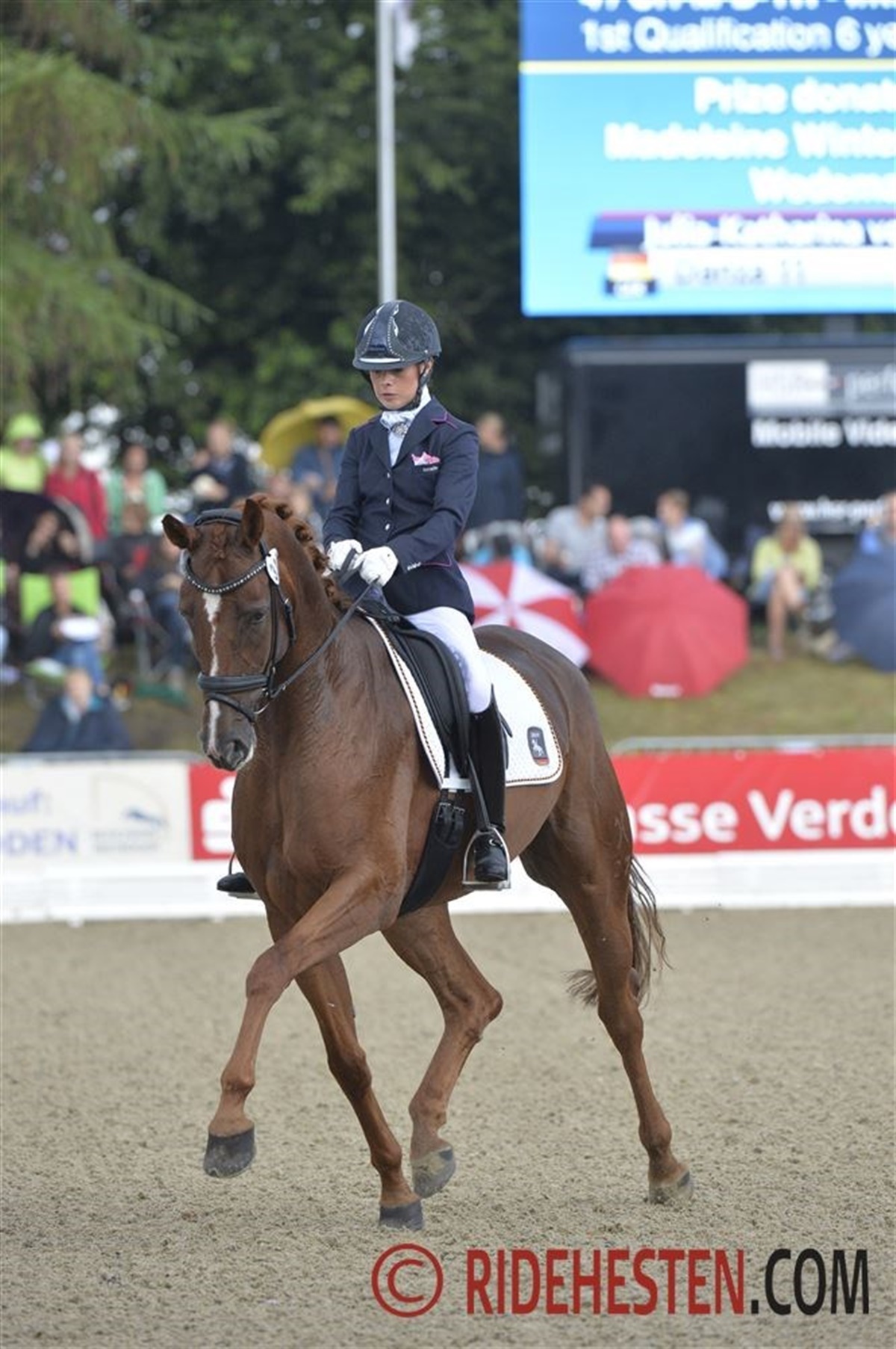 Lad det være sagt med det samme, kvaliteten af 6-års holdet stod slet ikke mål, med den fremragende kvalitet vi så i 5-års kvalifikationen i går. Der var også klassen igennem noget snak og uro på tilskuerpladserne, men da Dorothee Schneider red Sezuan ind på banen myldrede publikum til på begge kortsider, og så blev der helt stille på stadion. Den mørkebrune hingst var dybt koncentreret om ogaven og han imponedere med stort løft og taktfaste bevægelser. Med galoppen som et absolut højdepunt (9,8) i et ridt, som ellers bar præg af stor kvalitet, red Dorothee op ad midterlinjen i trav mod den afsluttende parade. Så kunne publikum altså ikke holde deres begejstring tilbage, de begyndte at klappe og huje inden hingsten blev redet ind i paraden. Det tog han nu helt roligt, og man forstår godt Dorothee da hun rakte begge arme i vejret og mimede wow!