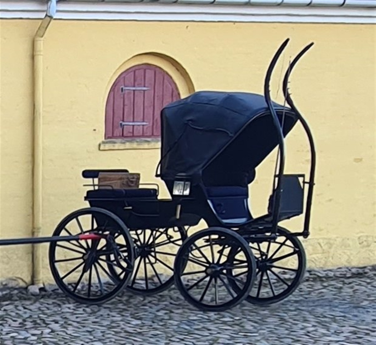 Vognen er sandsynligvis bygget omkring århundrede skiftet 1900. Umiddelbart ligner den et utal af andre vogne, hvor ejeren - herremanden selv - kørte, med plads til staldmand bag på, der kunne overtage, hvis nødvendigt. Det kunne være når ejeren skulle til møde eller selskabelighed. Men ved nærmere øjekast, ses et håndtag mellem lygten og baghjul. Det vidner om en fortælling om vognen. For når man er til selskabeligheder, kan man jo godt blive lidt træt, eller være ude af stand til at køre forsvarligt hjem. Derfor kan man, ved at løsne 4 mønstringer, flytte sæde med kalechen til bagsædet og bagsædet til kuskesæde, så kusken kan køre hjem, og ejeren side behageligt i skygge eller i ly for vejret, når kalechen er slået helt op.