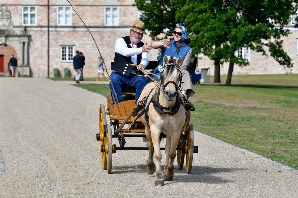 14 ekvipager var til start, de fleste med fine herskabsvogne, men også to arbejdsvogne, den ene en fjedervogn fra et lille husmandssted omkring 1920’erne med hø og høtyv. Hvis man ikke viste bedre var det som en Morten Korch film. Kusken var Kurt Kruse Madsen, der sammen med sin svigerinde passede perfekt til et husmandspar, der kom lige fra marken af. Ingen olie på hovene, hesten var pæn soigneret, men ikke som i topsport regi, som heller ikke ville være passende til et husmandsspand der kom lige fra marken. Men også en fortælling om en nok så vigtig ekvipage, der skaffede penge til føden for en stor del af befolkningen, der levede af et lille landbrug, i begyndelsen af det 19’ århundrede.