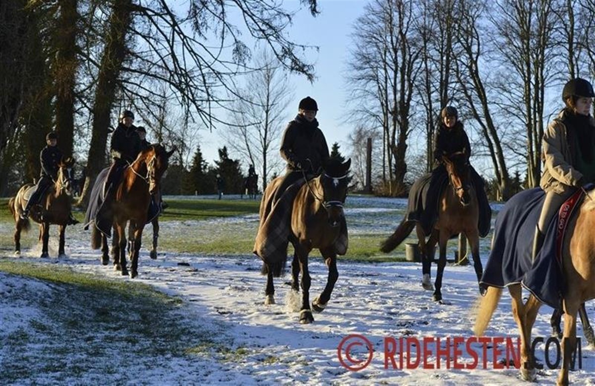 Er vejret til det, så rid også gerne udendørs, hvor fx bakker er en god kilde til opbygning af muskler hos hesten. Samtidigt adspredes hesten fra timerne i boks og ridehal. Er underlaget fast uden at være glat, så kan man med fordel udnytte sneen, da dyb sne byder på god styrketræning – kulden reducerer endda evt. inflammation i sener og led.