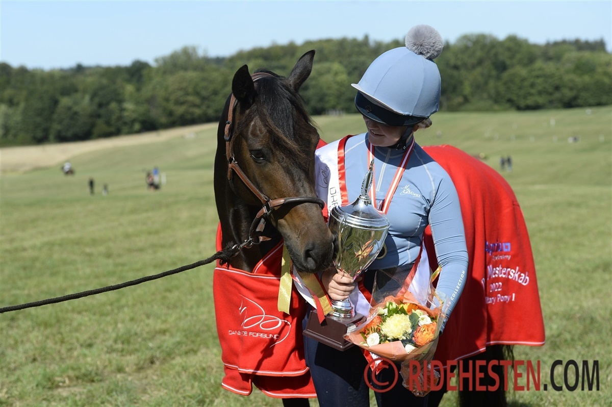 Herefter blev det spændende, da det første danske mesterskab skulle afgøres. Mesterskabet for kategori I ponyer. Gedsagergaards Roberto er vant til det røde vinderdækken, for det vandt den nu 14-årige pony også i 2019 og 2021 og nu igen i 2022. I år var det med Sofia Zornig Sylvestersen i sadlen, ekvipagen lagde sig i front allerede efter dressuren, men tog 8 strafpoints i springningen. Dog sluttede de i dag med en flot fejlfri runde i terrænet og sikrede guldmedaljen.