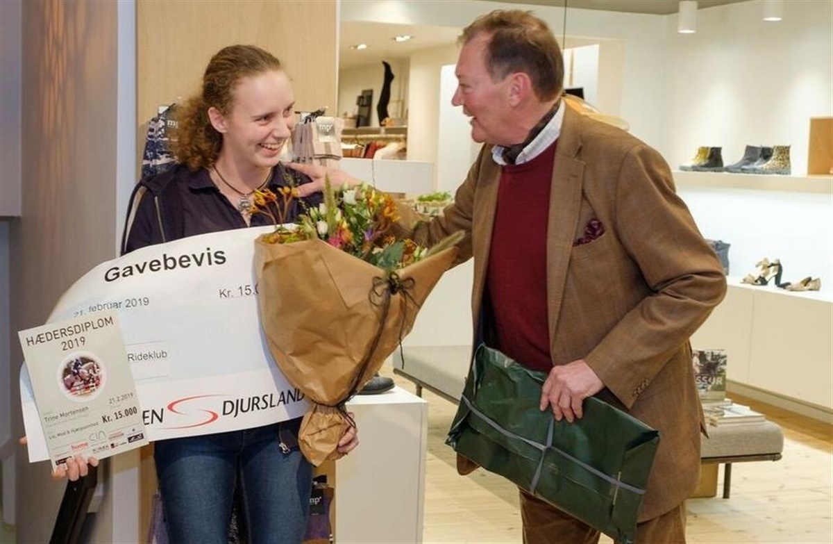 22-årige Trine Mortensen modtog både hædersbevis og legat på 15.000 kroner ved en overrækkelsesfest i modetøjforretningen CIN aps i Grenaa torsdag aften, og hun var "så glad og stolt":