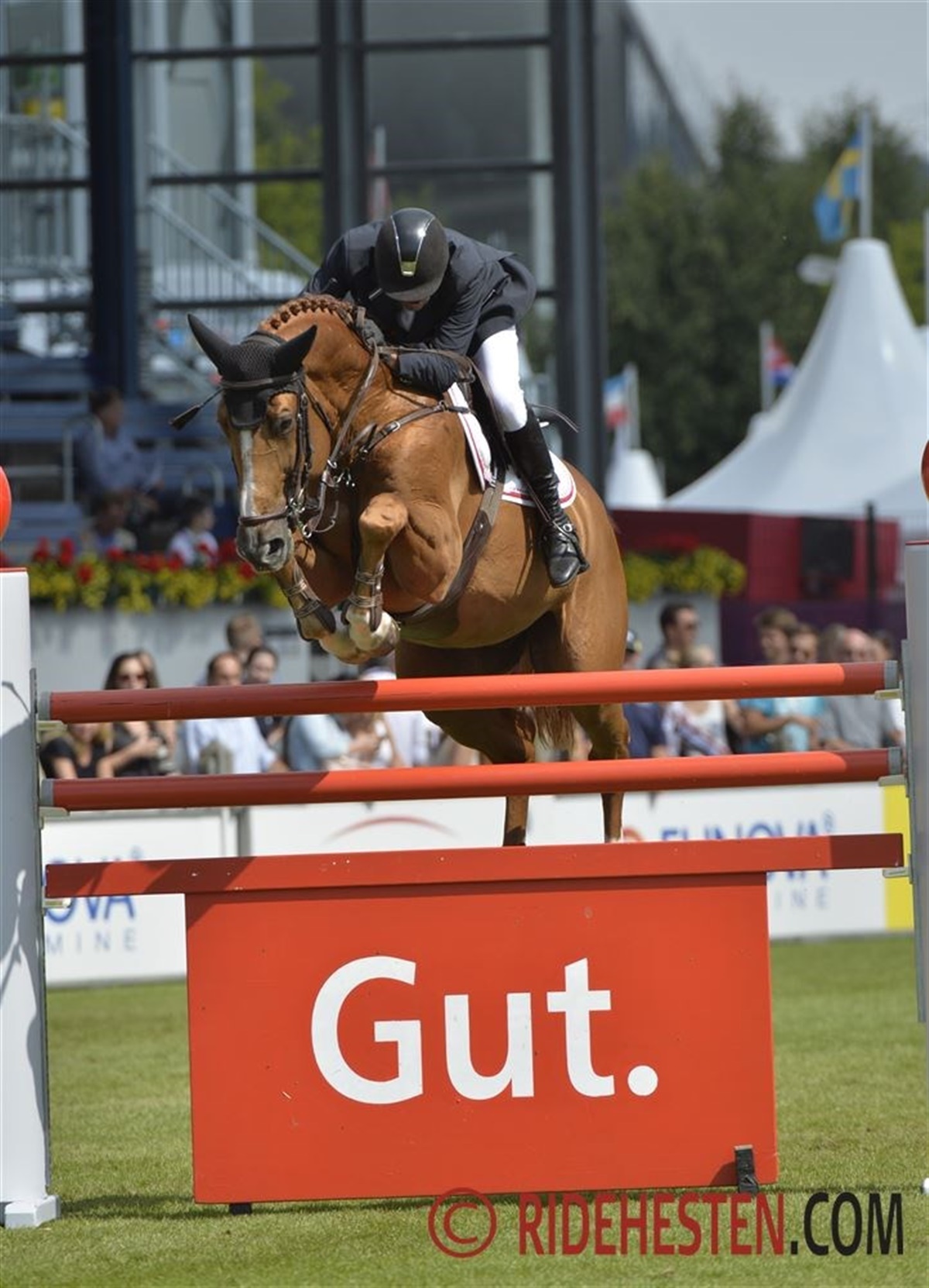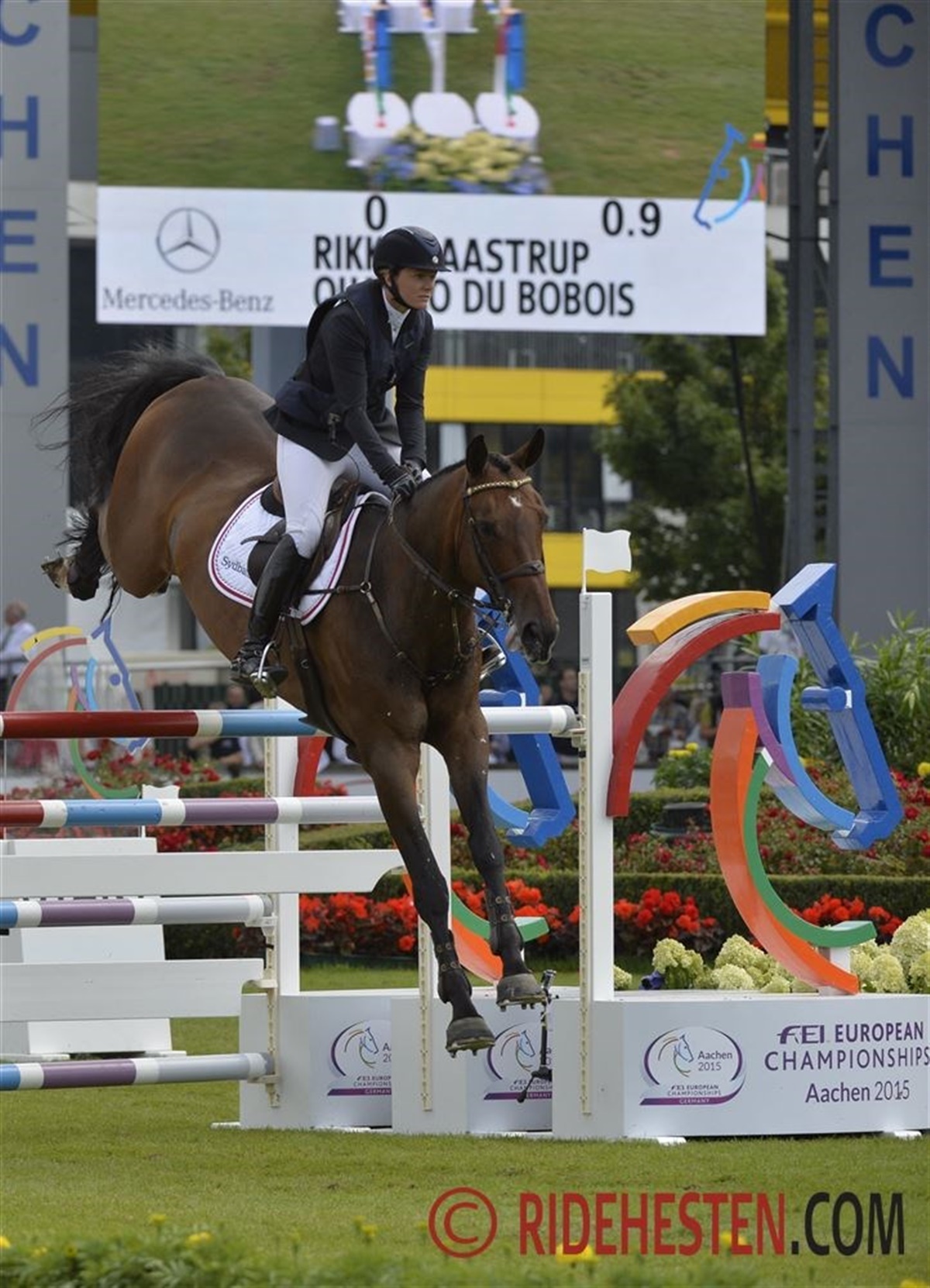 Rikke Haastrup red med stort overblik på banen med Qualico du Bobois - på den store vandgrav fik Rikke ikke lige det rette "svung" i hesten, der ramte listen med knap en hov - ærgerligt, men det var også alt det stod noteret på tavlen. Samtidig med at danskerne leverede snublede nogle af de nærmeste konkurrenter. Thomas Sandgaars Amarone svigtede ham igen i dag, det store stadion i Aachen er bare ikke hingstens hjemmebane, 20 fejl blev det til. Og så red Andreas Schou på banen med Lenardo der Kleine. Den lille knap 160 cm røde vallak ved heldigvis ikke hvor svært det er at forcere 160 cm høje og 180 cm brede forhindringer, og med et klasseridt af dimensioner galoperede Andreas fejlfrit i mål på "den lille".