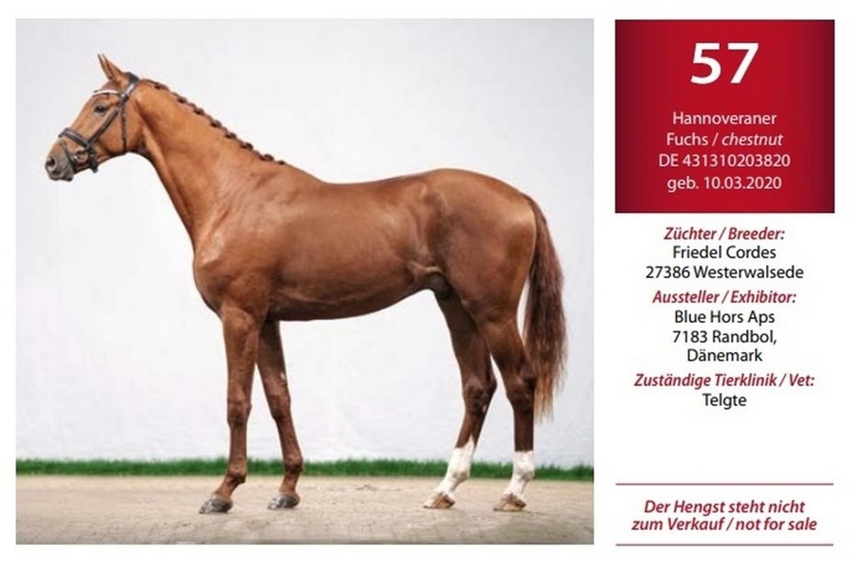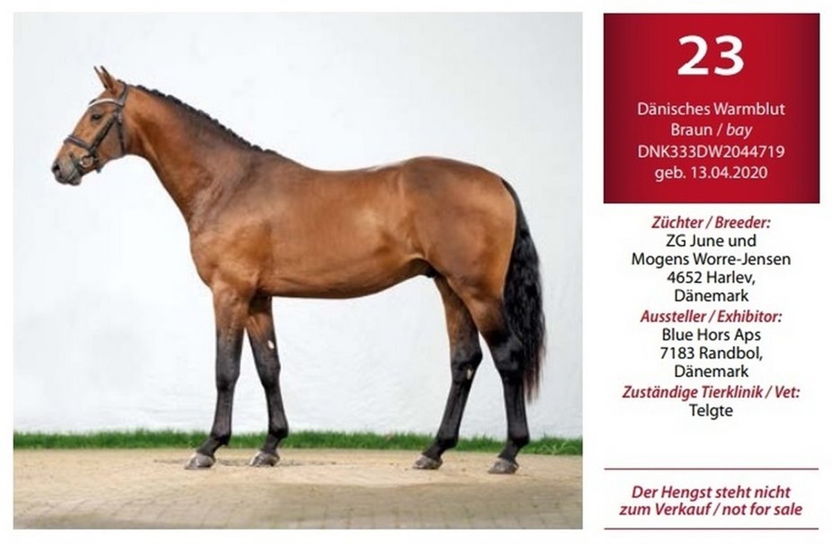 Helgstrand Dressage ApS fremstiller to tyskfødte hingstekandidater, nemlig kat.nr. 26 e. Grand Galaxy Win/ Samarant/ Weltmeyer og kat.nr. 46 e. Valverde/ Desperados/ Rotspon.
