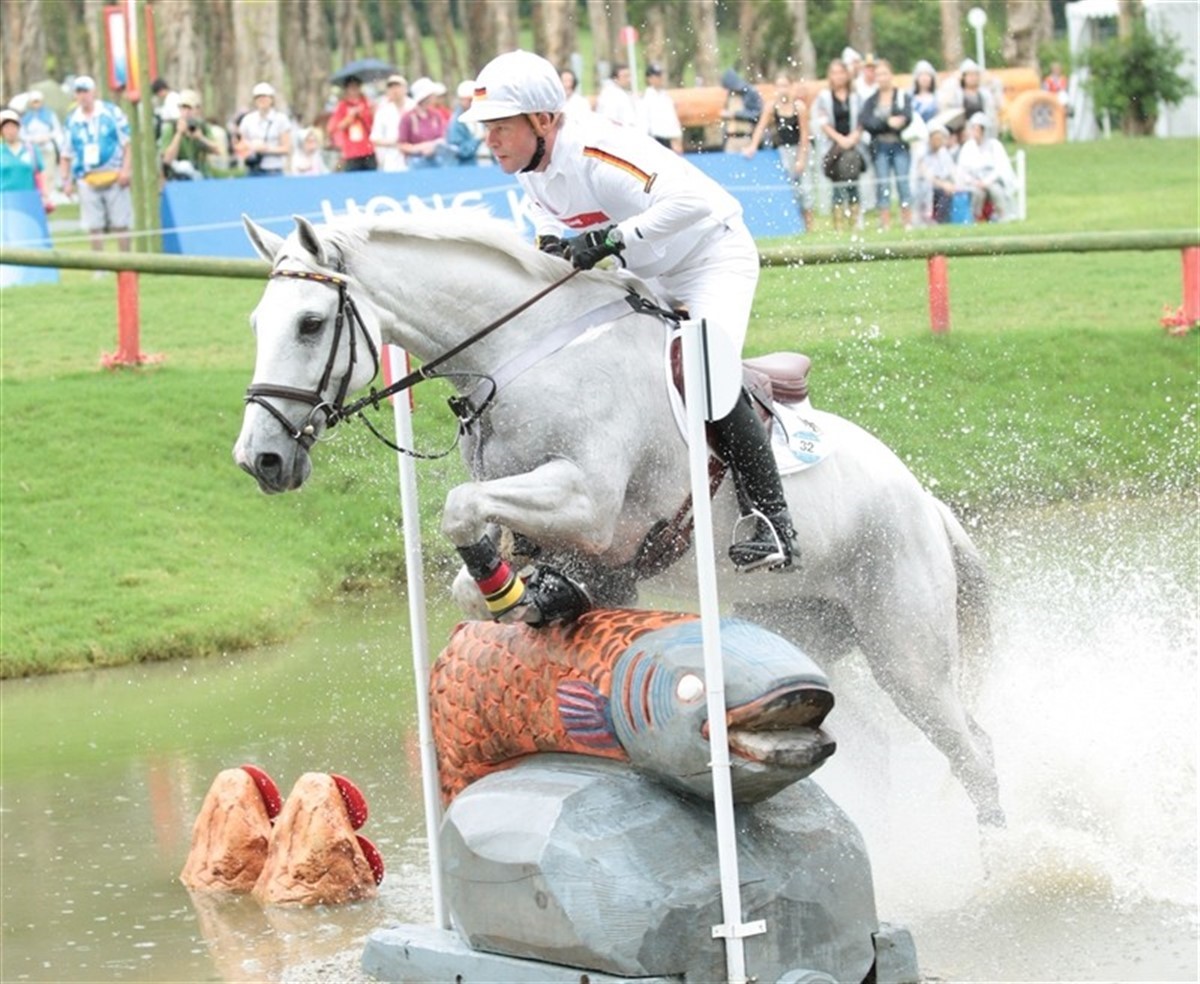 Tyskerne var helt fokuseret i dagens afgørende ridebanespringning ved OL i Hongkong - de tyske militaryryttere var totalt opsat på at få guldmedaljen i hus og det lykkedes. Tyskernes nærmeste konkurrent Australien var hele tiden tæt på, så presset var stort på både de australske og tyske ryttere, og publikum levede med i hvert eneste spring, og på den vis var de i høj grad medvirkende til at skabe OL-stemning. Tyskernes sejr kom i hus med en totalscore på 166,10 mens Australien sluttede på 171,20 og englænderne bibeholdt deres bronzemedalje med 185,70, og om knap en time skal de bedste 25 ryttere kæmpe om de individuelle medaljer. Den internationale olympiske komite ønsker ikke, at et ridt kan afgøre både hold- og individuelle OL-medaljer og derfor må hestene igen trækkes ud af stalden for den sidste og meget afgørende runde. Hvilke heste har konditionen og koncentrationen til at gå fejlfrit? Stillingen i toppen er uændret med Hinrich Romeike i front foran Ingrid Klimke og nu med Megan Jones på tredjepladsen, men mellem de otte første ryttere er der kun et nedslags afstand.