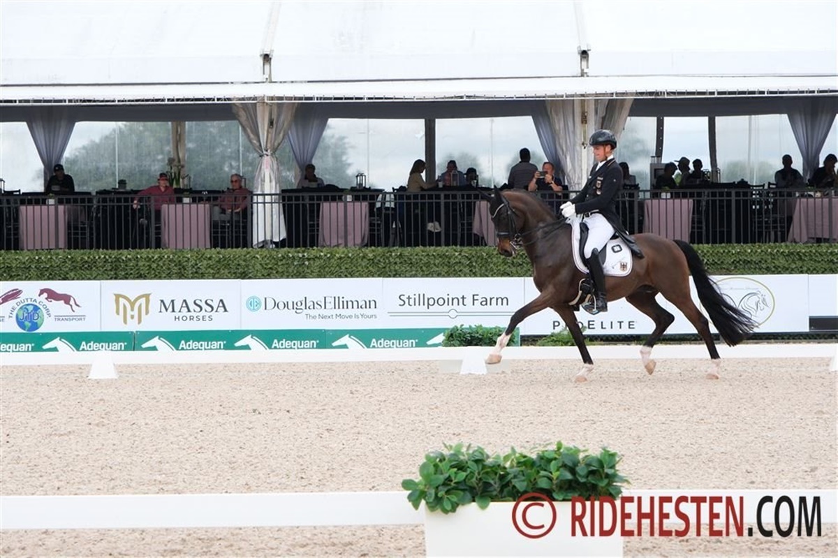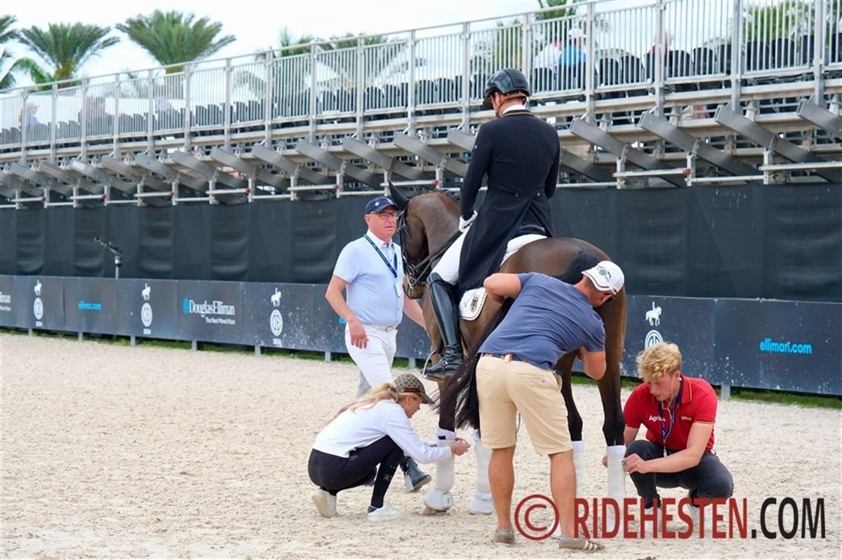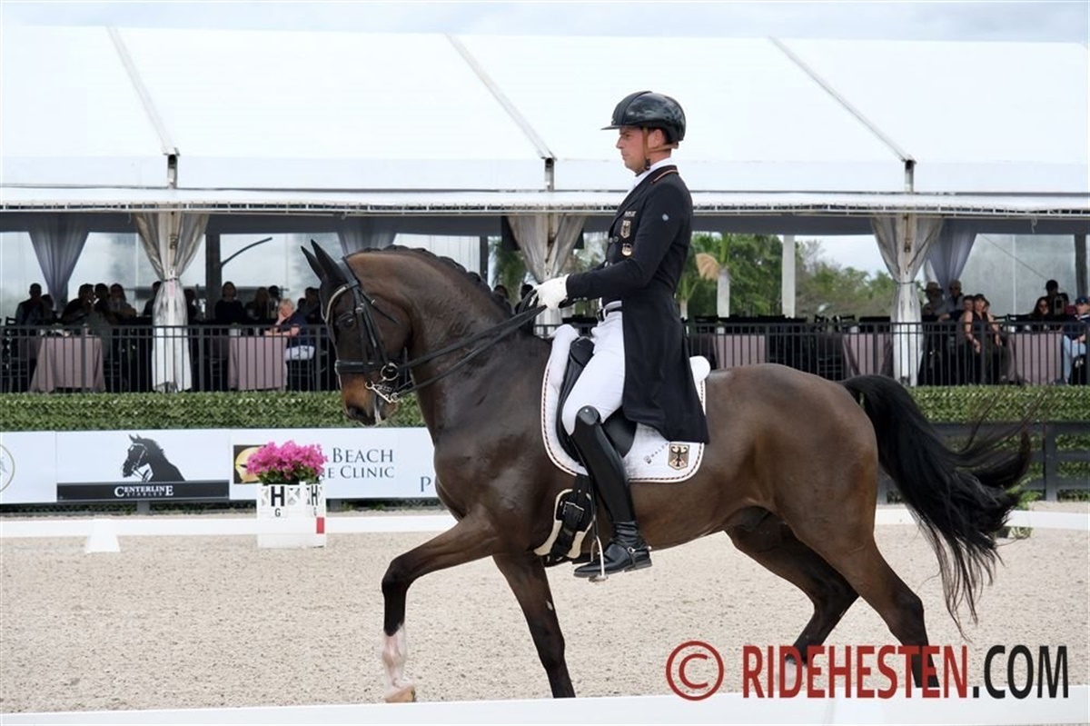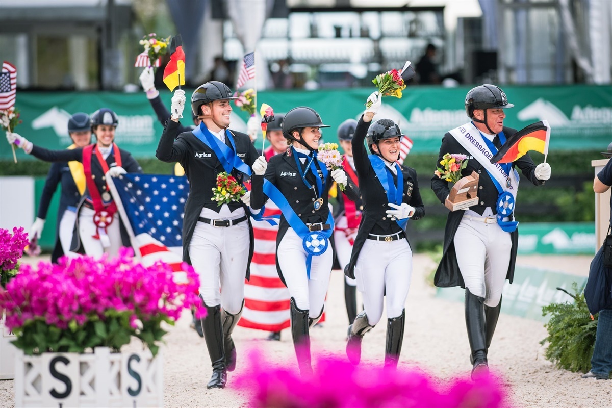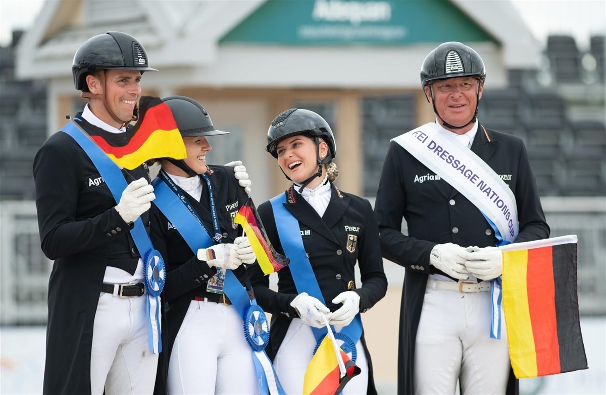 I går eftermiddags lykkedes det så Tyskland at vinde guld for fjerde gang i træk i Nations Cup ved Global Dressage Festival. Det tyske hold bestående af Felitas Hendricks og Drombusch e. Destano/ Dimaggio (72,087%), Fredric Wandres og Total Recall e. Totilas/ Sandro Hit (70,456%), Anna-Christina Abbelen og Sam Donnerhall e. Samarant/ Donnerhall II (70,826%) samt Michael Klimke og Domino e. Den Haag/ Weltmeyer (67,565%) opnåede tilsammen en score på 213,369% (de tre første point talte med i resultatet).