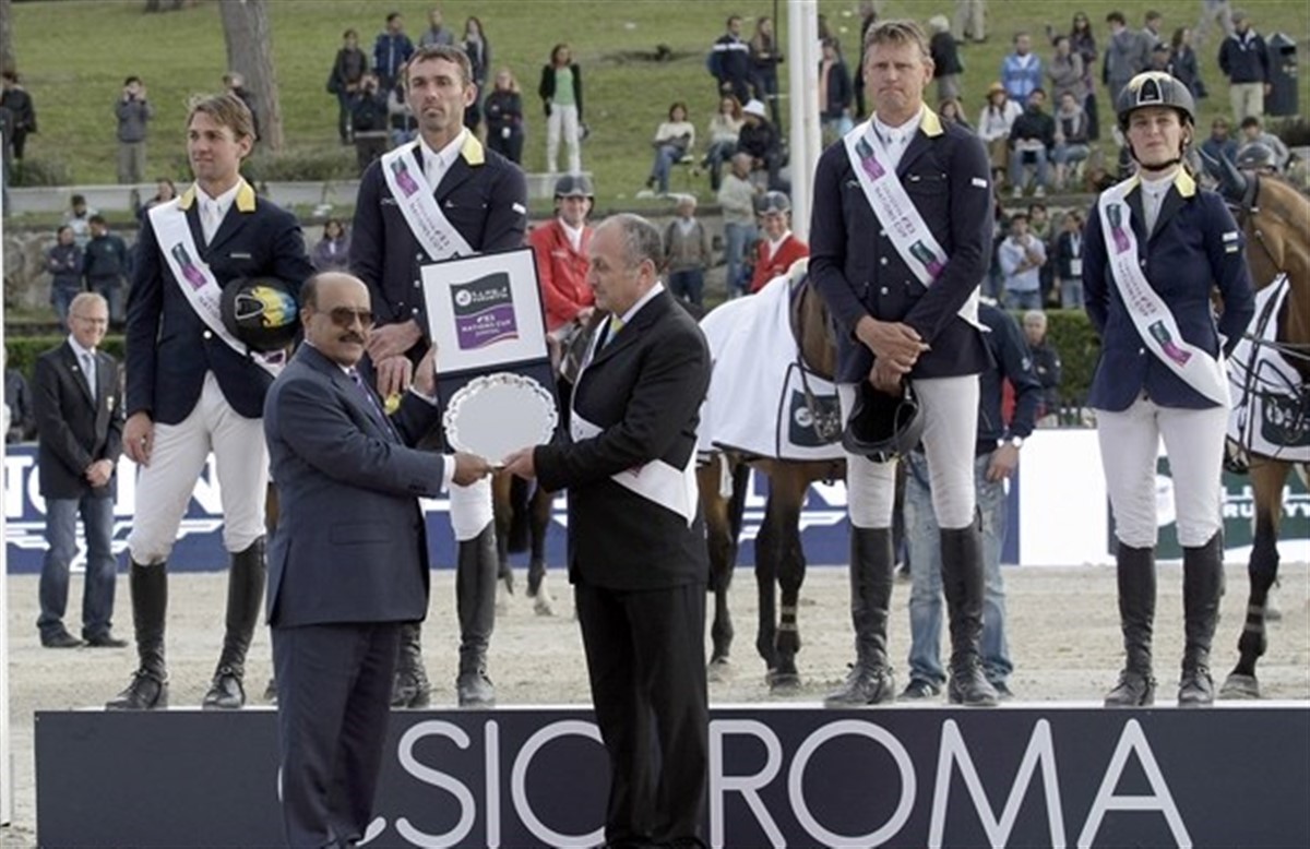 Det blev Tysklands Ludger Beerbaum, som indledte omspringningen med 4 fejl i tiden 40,84 sekunder. Patrice Delaveau fik ligeledes fire fejl i en dårligere tid, og dermed var det op til Ukraines Casion Rivetti og Temple Road at sikre sejren med en fejlfri runde. Det red han efter, men så langsomt, at han blev noteret for 3 tidsfejl, men det var nok til at sikre Ukraine sejren i Rom.