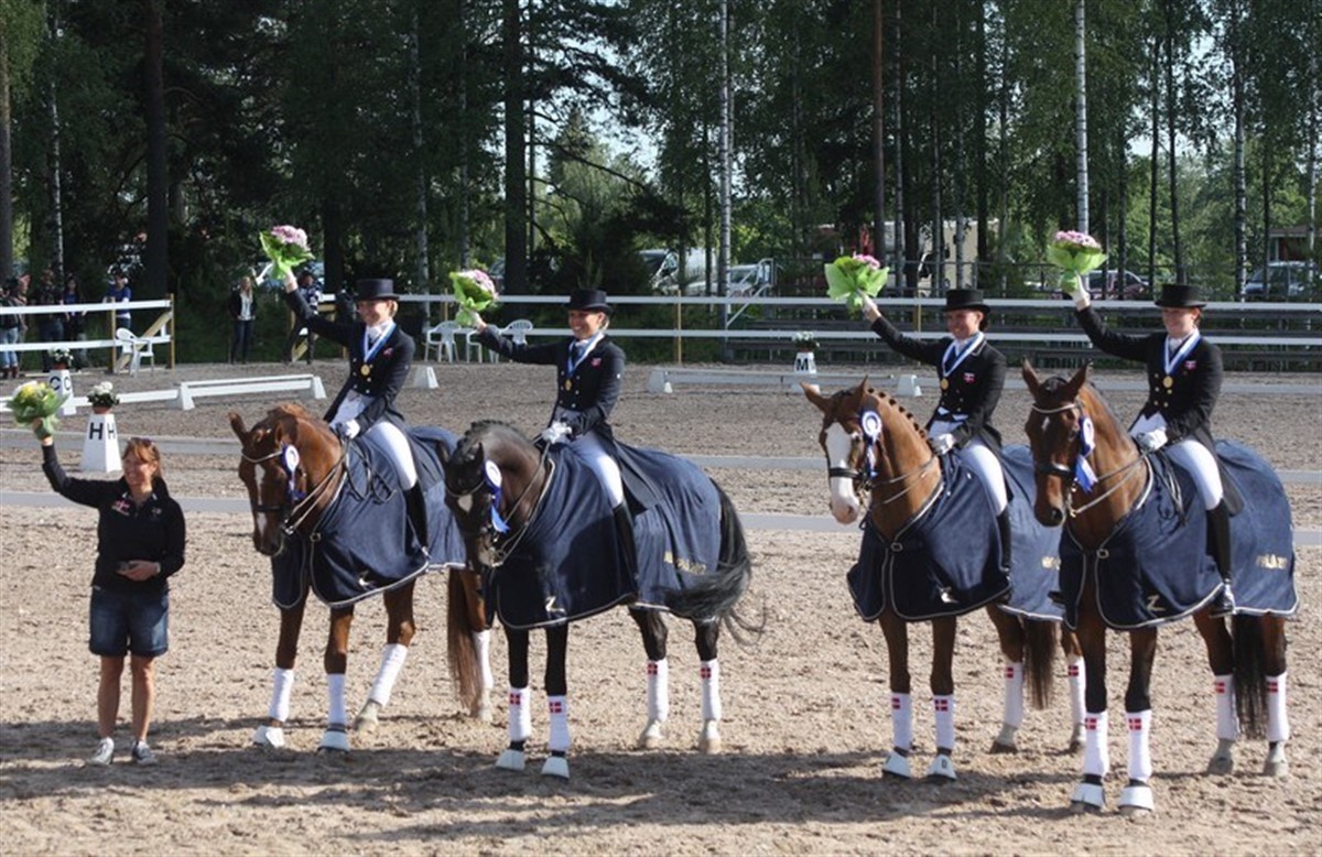 Ungrytterlandsholdet leverede en flot præstation, da de med 206,684 % sikrede sig guldet i holdkonkurrencen ved NM. Sølvet gik til Sverige med 201,026 %, mens Norge fik bronze med 197,052 %. På Sandagergaards Lorentino e. Lorentin I / Arizona Alfarvad (opdr. Louise Marie Nissen) leverede Nicoline Graff dagens bedste resultat på 70,895 %. Christina Møller og Wizard Of Oz e. Wittinger / Grande blev placeret som nr. 3 med 68,105 %, mens Anja Bodé og Atterupgaards Valdemar Welt Hit II / Frühling (opdr. Atterupgaard) blev placeret som nr. 5 med 67,684 %. Line Tange Jacobsen på Cinnamon V e. Come Back II / Lobster (opdr. John Byrialsen) blev nr. 7 med 67,053 %. NM-stævnet varer til søndag og omfatter NM i både springning og dressur for pony, junior og ungryttere. Kilde: DRF